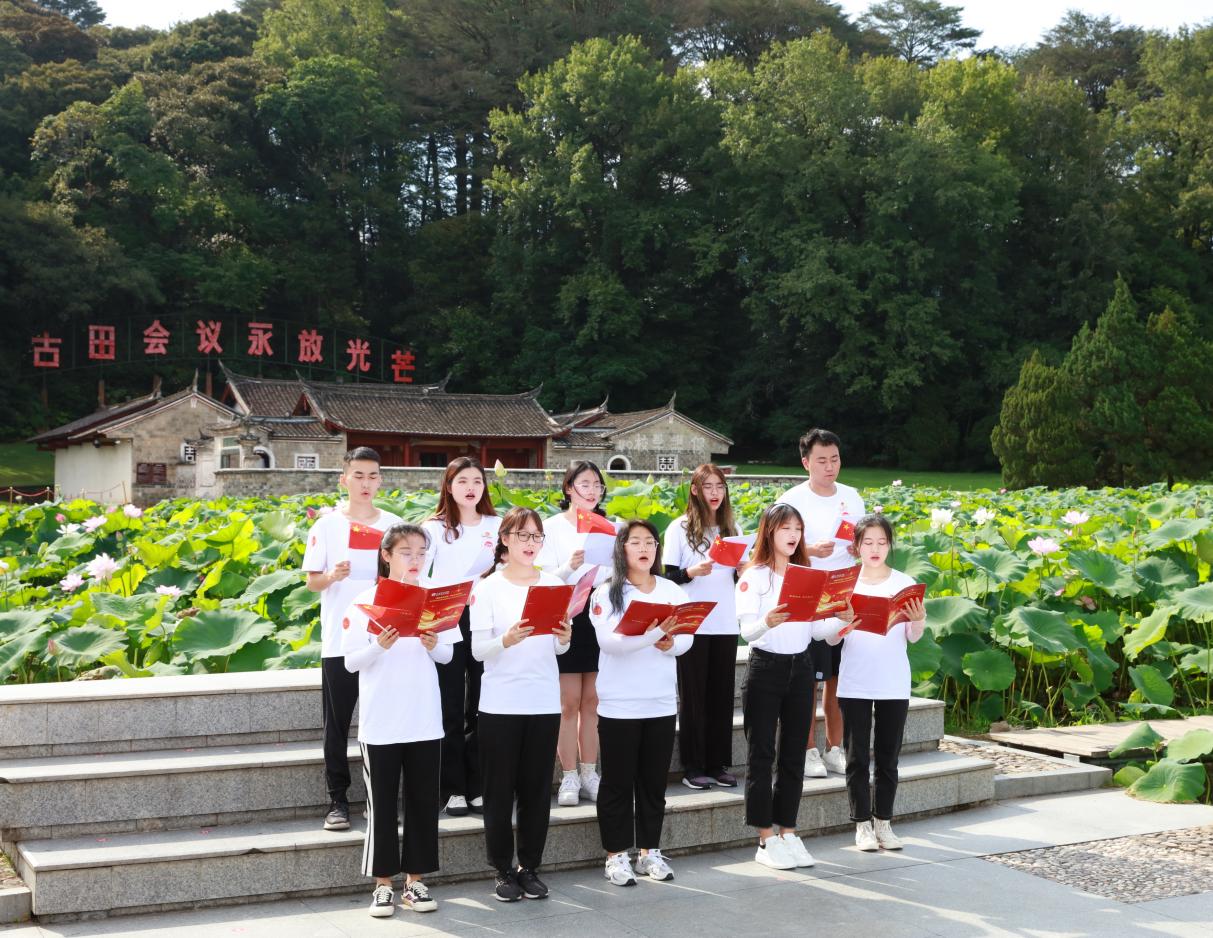 读书社实践团成员于古田会议旧前用中英结合的方式诵读
