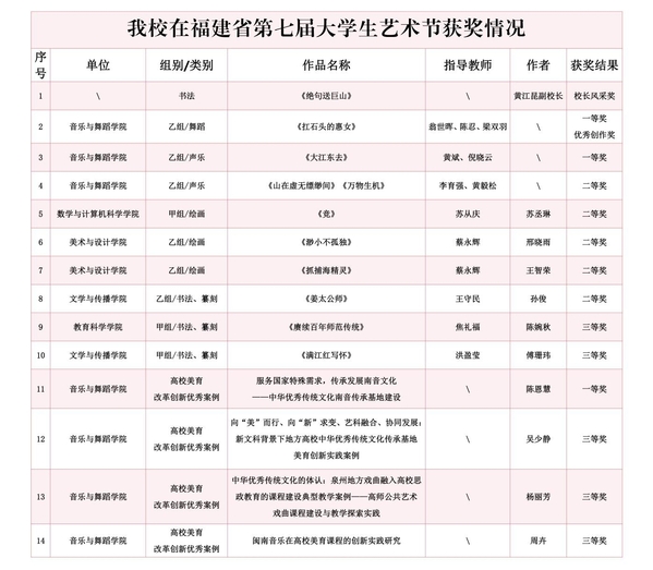 其中,由副校长黄江昆创作的书法作品《绝句送巨山》、音乐与舞蹈学院翁世晖、陈忍、梁双羽老师编排的舞蹈《扛石头的惠女》以及陈恩慧老师撰写的美育改革创新优秀案例《服务国家特殊需求,传承发展南音文化——中华优秀传统文化南音传承基地建设》获省教育厅推荐,将代表福建省参加全国第七届大学生艺术节展演。