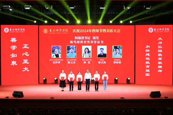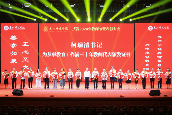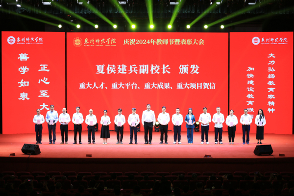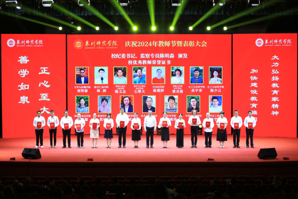 校纪委书记陈明森宣读2024年校优秀教师等表彰决定副校长陈秋燕通报一年来获得各级各类表彰情况和重大人才、重大平台、重大成果、重大项目情况。校领导分别为获奖教师、表彰对象颁发荣誉证书、贺信。