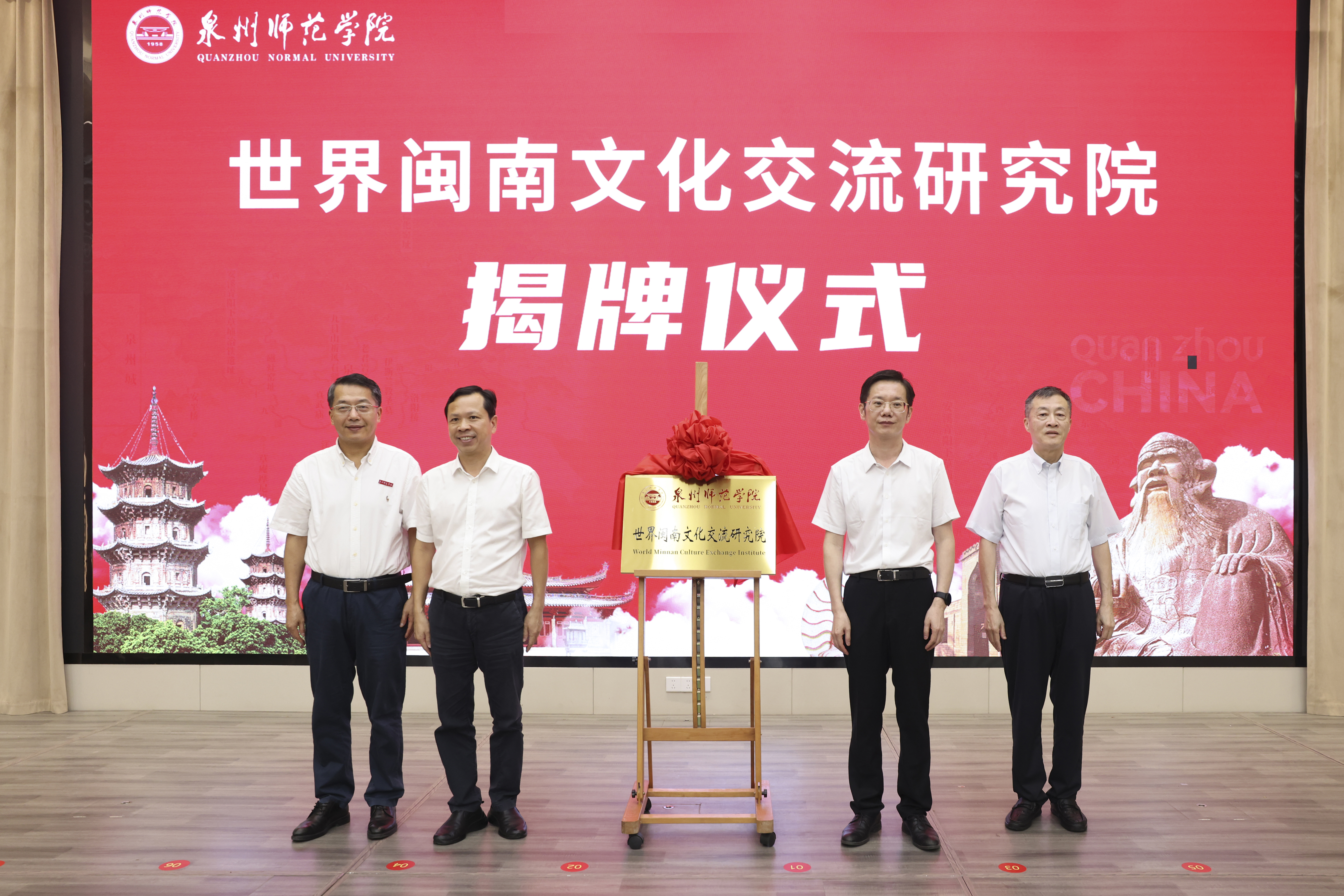洪金镖、刘林霜、林晓峰、柯瑞清共同为英国威廉希尔公司官网世界闽南文化交流研究院揭牌。