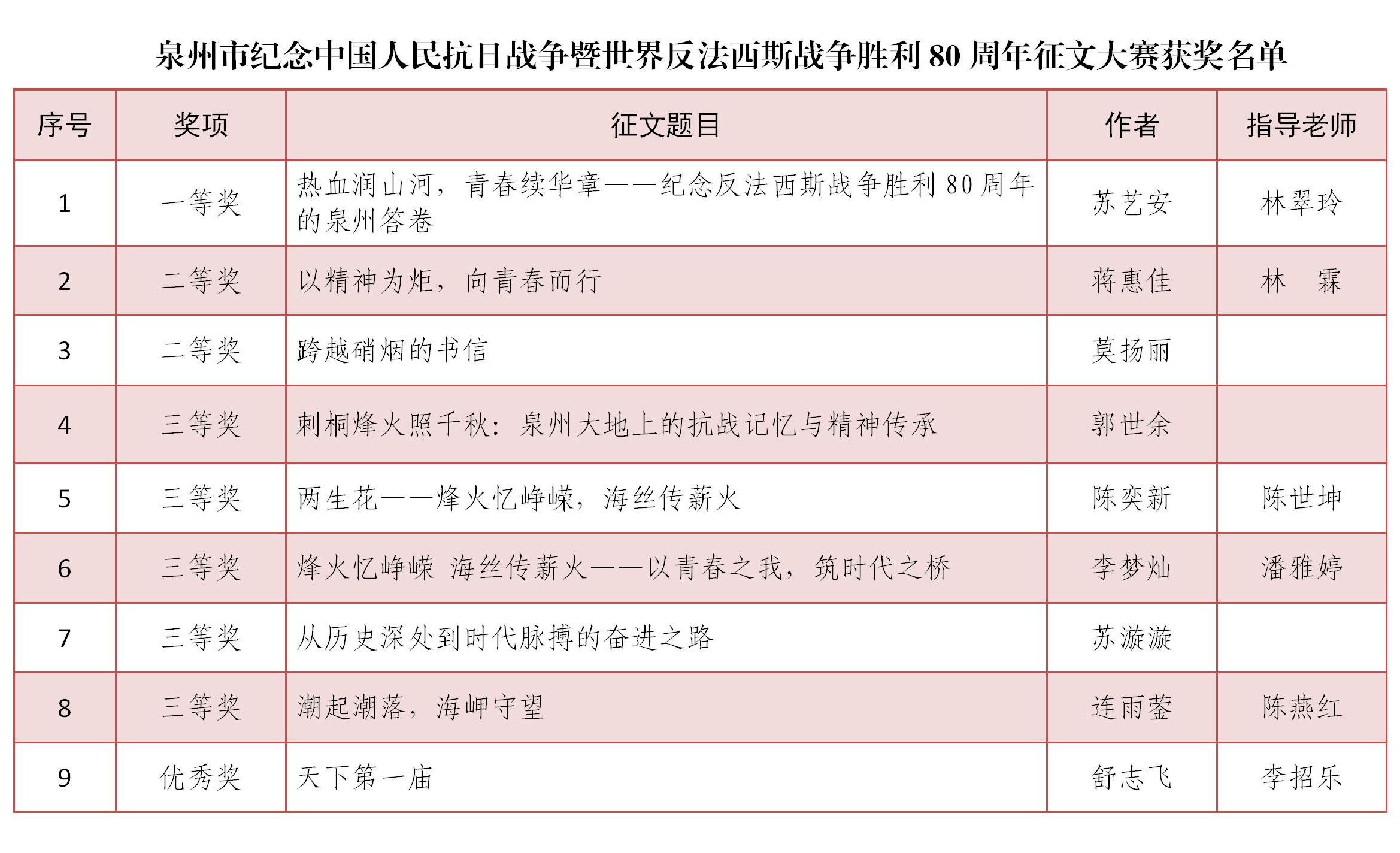 日前,“烽火忆峥嵘 海丝传薪火”——泉州市纪念中国人民抗日战争暨世界反法西斯战争胜利80周年征文大赛获奖名单公布,我校获一等奖1项、二等奖2项、三等奖5项、优秀奖1项。