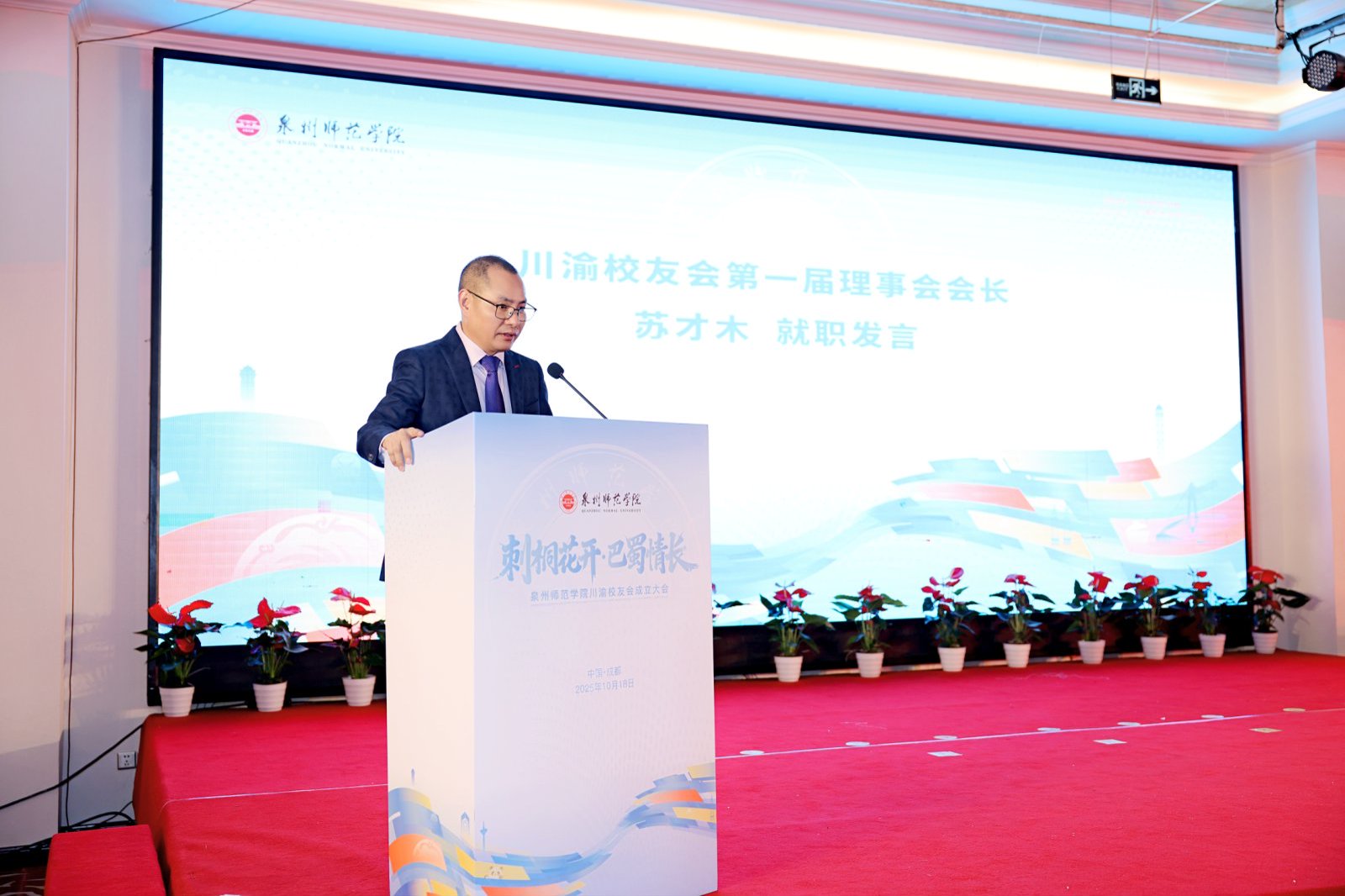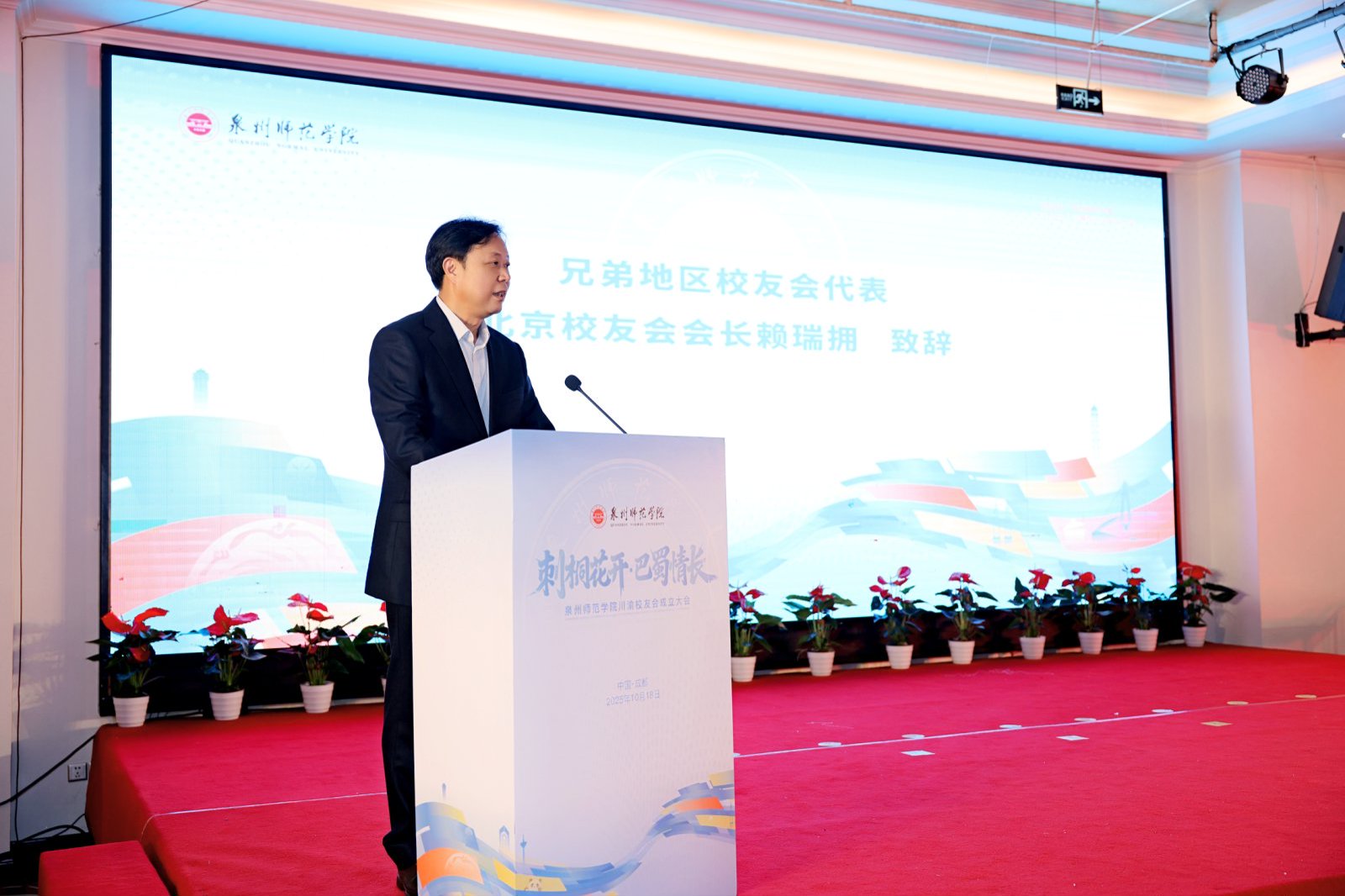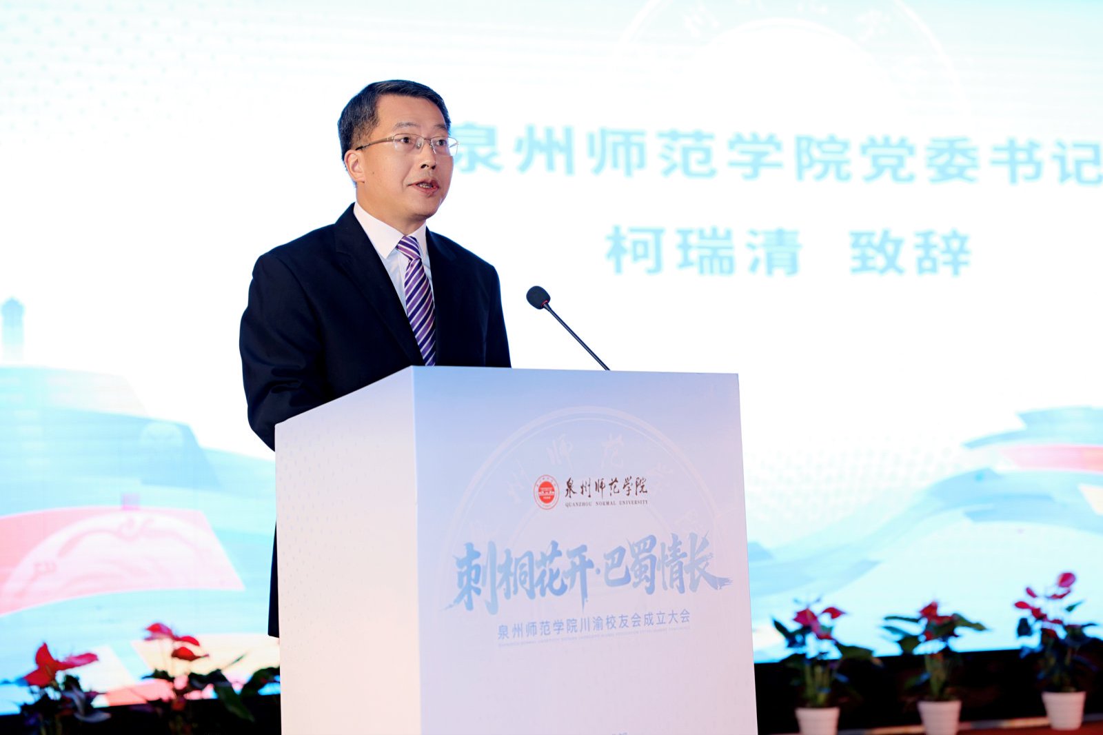 柯瑞清代表学校向川渝校友会的成立表示祝贺。他指出,校友是泉师历史的见证者、亲历者,也是泉师文化的传承者、发扬者,更是泉师发展的推动者、建设者。川渝地区作为我国西部腹地的经济文化重镇,历来是我校校友创新创业的热土。校友们用实干诠释了“泉师人”的责任与担当,为川渝地区的教育振兴、经济发展、文化繁荣作出了重要贡献,也为母校赢得了良好声誉。他希望川渝校友会能成为“凝聚校友的港湾”,搭建常态化交流平台,传递母校动态,分享校友资讯;成为“赋能发展的桥梁”,积极整合资源,为母校与川渝地区的交流合作搭建新的桥梁,打造“校友经济”品牌,实现“校友+母校+地方”的共赢格局;成为“文化传播的使者”,发扬“敢为人先、爱拼敢赢”的泉州精神,传承“善学如泉、正心至大”校训精神,以更好的业绩、更大的成果回报母校、回报社会。