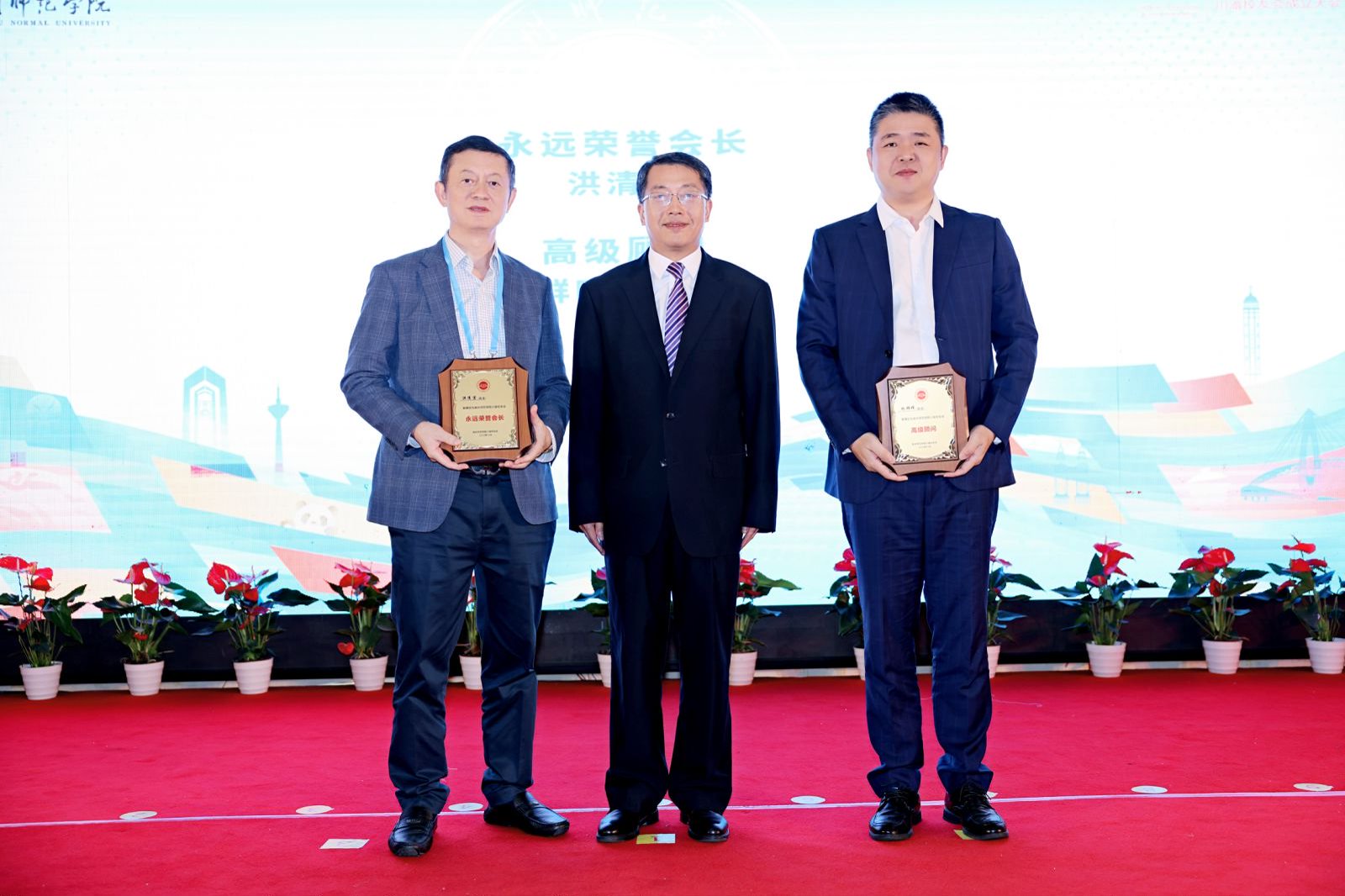 柯瑞清为洪清宜授“永远荣誉会长”荣誉牌,为杨群晖、洪清鹏授“高级顾问”荣誉牌,陈昌萍为川渝校友会授旗,为新当选会长苏才木、执行会长兼秘书长刘璋佩授牌,黄江昆为四川省闽南商会会长洪辉煌、重庆泉州商会会长吴碧水、成都福建商会会长黄团顺、成都泉州商会会长吴晓东、成都洛江商会会长林从金、成都南安商会会长许德阳、成都惠安商会会长张惠忠、成都安溪商会会长苏明武、四川省建筑装饰商会会长张清杰、在蓉泉籍乡贤陈世清授“顾问”荣誉牌。