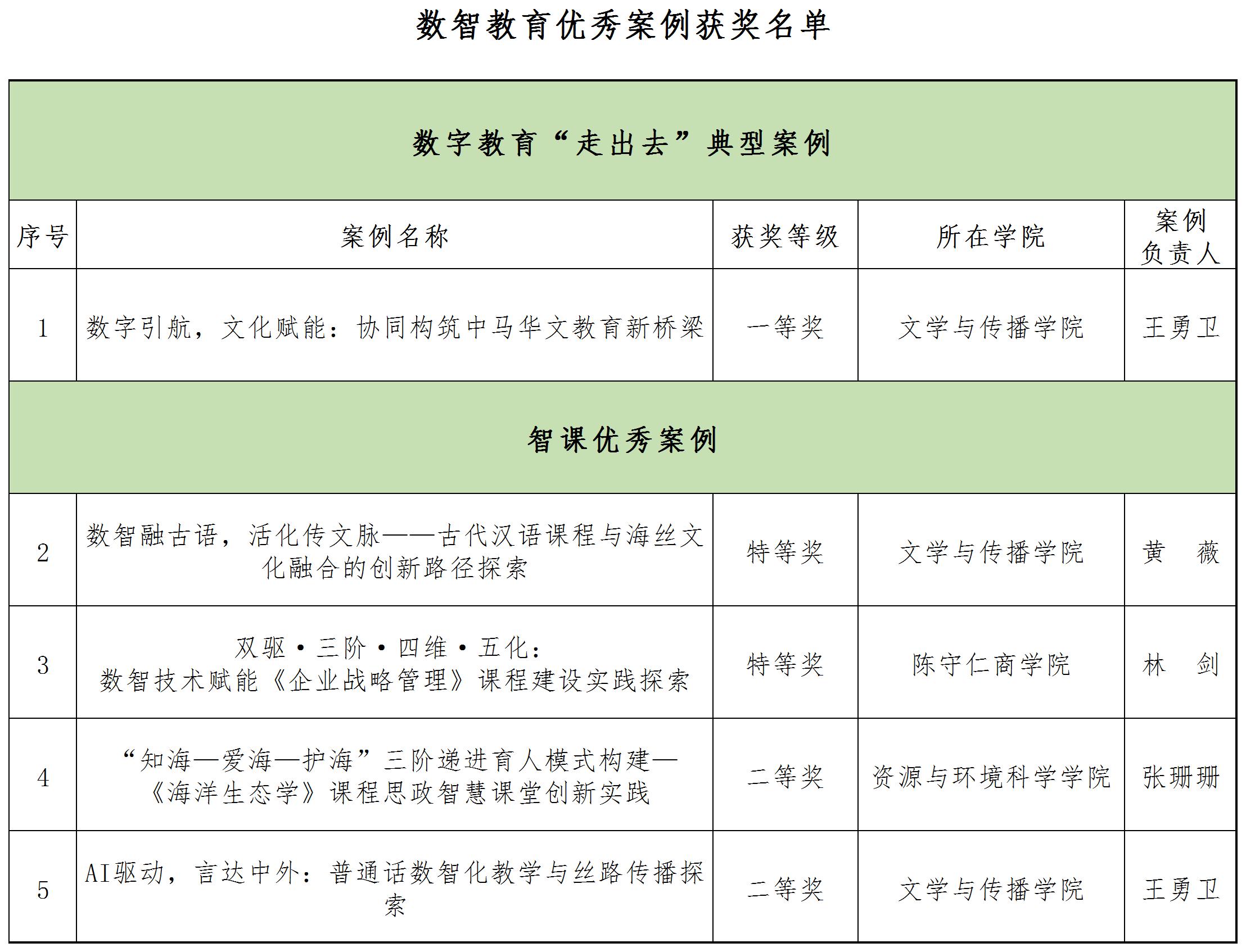 此外,《“元智码链”—— 基于多模态数据融合的程序设计类课程个性化自适应学习路径探索》(数学与计算机科学学院曾台盛教授)和《AI即爱·启智共生·化育新境——文旅商展融合背景中的闽南文化金课“三力五元”教学模式》(文学与传播学院王伟教授)2项案例由eMOOC 联盟(电子信息类慕课联盟)推荐,将在第六届全国智课教育创新大会上展示。