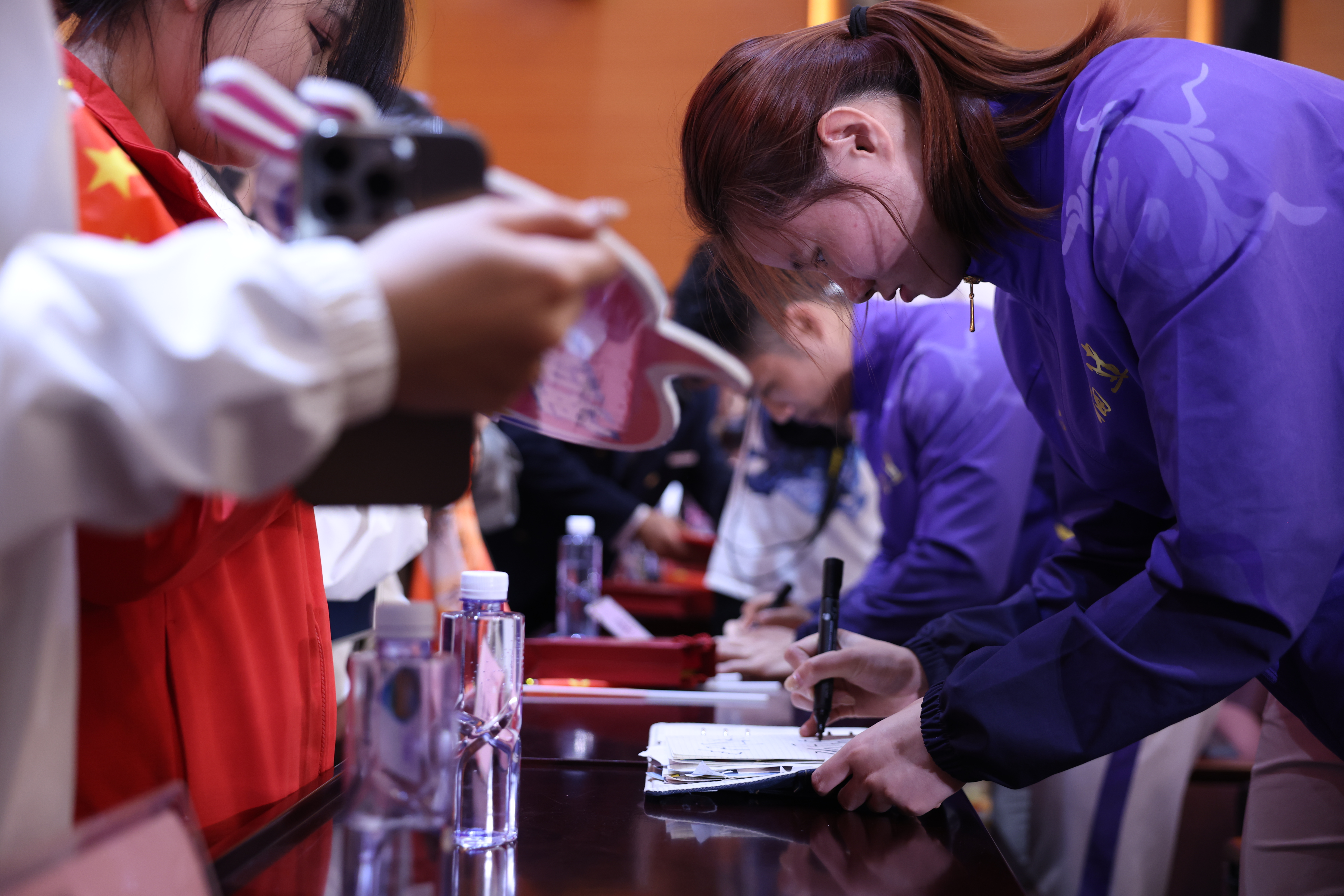 当《歌唱祖国》的激昂旋律响起,全场师生与健儿们共同起立,挥动手中的小国旗齐声合唱,红色的浪潮与滚烫的爱国情怀在报告厅内交融。签名环节中,同学们排起长队,健儿们在签名板上留下珍贵印记,并不时与同学们亲切互动,传递鼓励与祝福。活动最后,全体参与人员在特教大楼门口合影,为此次“运动校园”主题活动画上圆满句号。