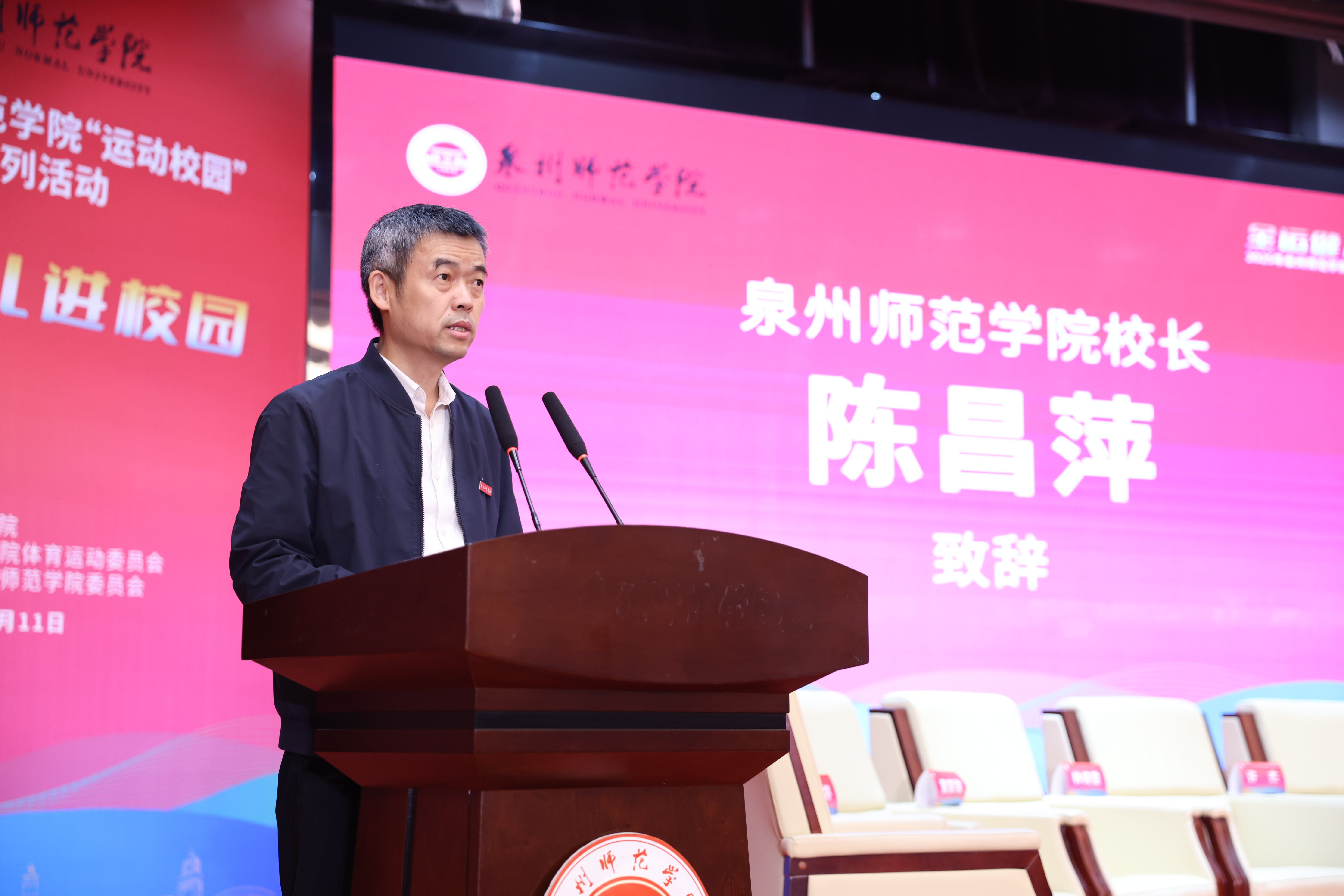 活动在庄严的国歌声中拉开帷幕。陈昌萍在致辞中对全运健儿的到来表示热烈欢迎,介绍了学校的办学历史和发展成就。他表示,学校始终坚持“五育并举”教育理念,持续深化体教融合,打造“体育课程云超市”等特色品牌,精心构建“运动校园”生态体系,体育学院荣获“全国群众体育先进单位”称号。他指出,全运健儿是中华体育精神的践行者,是新时代青年的学习楷模,此次活动既是一场体育文化盛宴,更是一堂生动的“大思政课”,希望同学们从全运健儿们的奋斗故事中汲取力量,养成终身锻炼的习惯,在体育运动中健全人格、锤炼意志。
