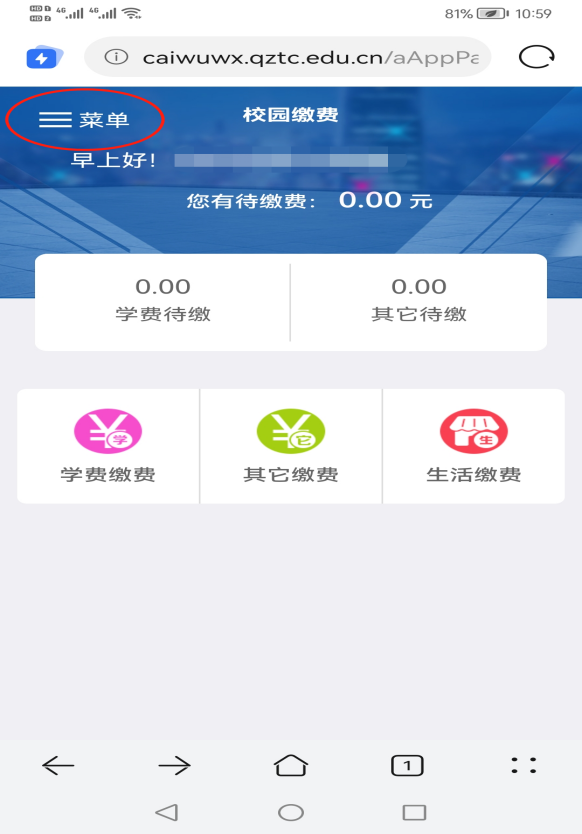 (一)手机端登录https://caiwuwx.qztc.edu.cn/ 根据标记操作,如图所示:步骤①登录后点击菜单;步骤②点击已缴款查询;步骤③点击明细及电子票;步骤④点击查询。
