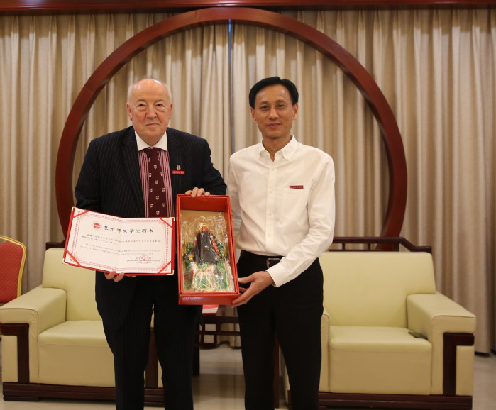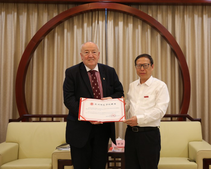 Party secretary Zhu Shize, on behalf of QNU, welcomed the visit of Mr. Harris and the delegation. He hoped that in the future, the two sides would make full use of their own advantages in running schools, share high-quality resources, and focus on diversified cooperation in undergraduate and postgraduate education. Harris commented that QNU owns unique regional superiority and local education features. In the future, the two universities have broad space for cooperation in personnel training, academic research and so on. President of QNU Qu Guangqing awarded Harris the appointment of guest professor. Zhu Shize exchanged souvenirs with Harris, wearing the school badge of QNU for Harris, and then a group photo was taken.