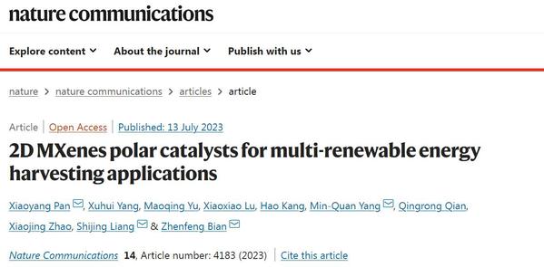 Recently, the research paper 2D MXenes Ppolar Catalysts for Multi-renewable Energy Harvesting Applications by QNU Professor Pan Xiaoyang's team from the School of Chemical Engineering and Materials was published online in the prestigious international journal Nature Communications (IF: 16.6, Chinese Academy of Sciences Category I, TOP Journal, H-index 248). QNU is the first signing unit, with Professor Pan Xiaoyang as the first and corresponding author. Professors Yang Minquan from Fujian Normal University, Liang Shijing from Fuzhou University, and Bian Zhenfeng from Shanghai Normal University are listed as the co-corresponding authors.