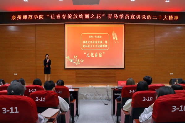 校团委在深入实施“青马工程”的基础上,培养选拔宣讲骨干,组建“青马学员说”宣讲团,培育打造宣讲“青骑兵”。成员们精心准备,认真打磨,寻找理论宣讲“青”角度,围绕党的二十大精神和百年党史,结合时事热点和共产党人精神谱系,融入所思、所感、所悟,讲述“习近平总书记视察红旗渠青年洞”“四史教育”“我和我身边的中华优秀传统文化”“核盾功勋林俊德将军故事”“雷锋精神传承”“华侨爱国故事”“学校百年师范教育故事”等多个主题故事。