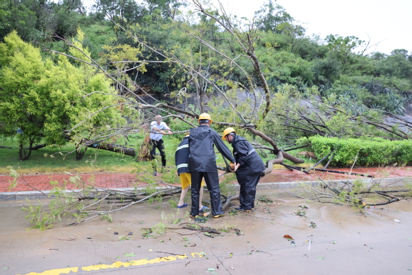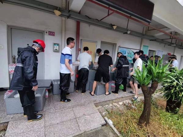 党员突击队打头阵。机关党委牵头组建“党员突击队”,党员亮身份、当先锋,服从统一调度,奔赴抢险救灾最需要的地方。狂风暴雨造成校园内树木倒伏,路面积水,党员突击队队员们全力出动,迅速赶往现场,及时协助清除路面障碍,疏通路面积水,确保校园主干道的正常通行。突击队队员们化身“外卖小哥”,无惧风雨,深入一线,在注意自身安全的同时,奔波于学生宿舍楼之间,确保622名暑期留校的学生能准时吃上可口的饭菜,并及时叮嘱留校学生做好安全防范台风工作。