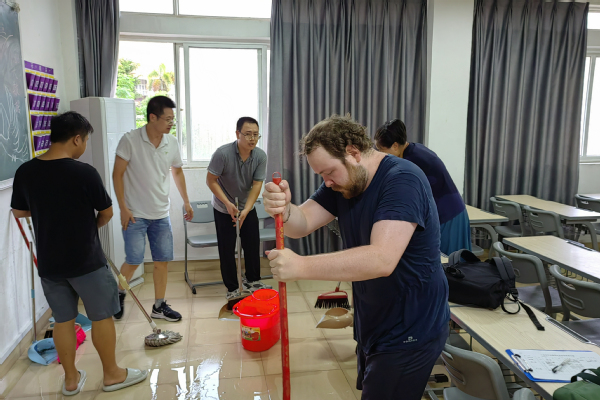 救灾抢险队挑重担。后勤、保卫、宿管中心工作人员积极投身抗台抢险第一线,100多位工作人员驻守校园,哪里有险情就投入哪里的应急救险。巡查主要路段,修理各种故障,排除阻塞下水道,抢修重要设备……有的教职工主动放弃休假,第一时间从外地返回学校,巡逻在一线、吃住在一线,连续20多个小时奋战在一线。7月26日刚到校报到的外籍教师、东华大学青年博士肖恩(Sean)也主动要求、积极投入防抗和灾后清理工作中。