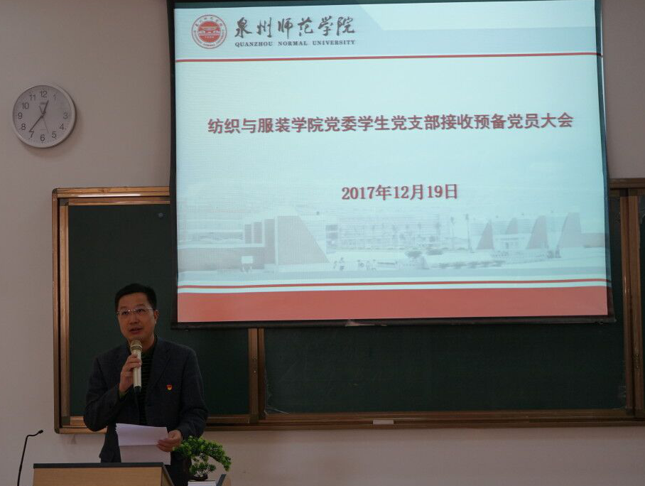 12月19日中午,纺织与服装学院党委学生党支部在荣助梯教212召开接收预备党员大会。纺织与服装学院党委书记张玉武、学生党支部书记聂莹,学生党支部副书记孙浪涛,辅导员程钟洛,以及学院全体学生党员、入党积极分子参加此次大会。大会由学生党支部书记聂莹主持。