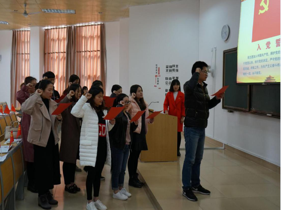 大会的最后,由学生党支部副书记孙浪涛领誓,11名预备党员面向鲜红夺目的中国共产党党旗,整齐列队,紧握右拳,高声宣读入党誓词,向党组织作出郑重承诺。