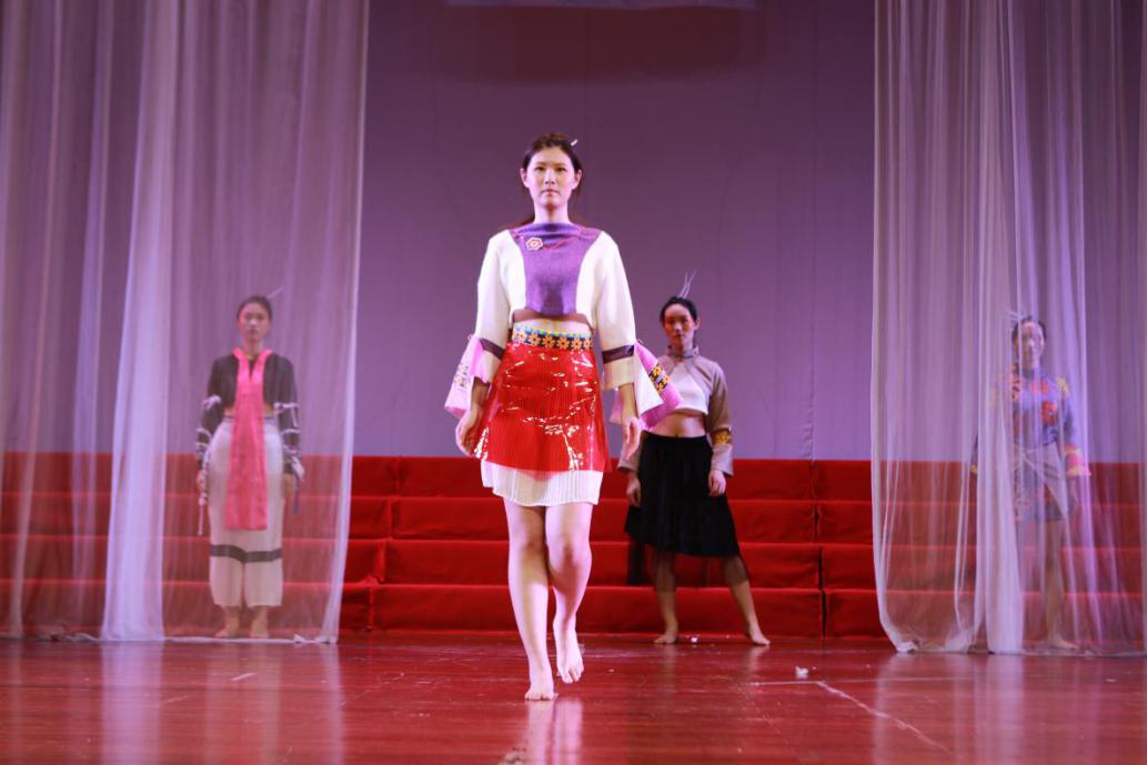 此次动态展在5月11日晚8点祖昌礼堂展示的作品包括服装、鞋类和箱包三个设计类别,融合了休闲、时尚、怀旧等不同风格,同学们的设计作品很好地诠释了传统与现代,经典与流行、文化与时尚的完美结合,很多设计作品不再单纯注重服装的外在形式,而是注重衣服背后的社会意识和人文关怀。其中多套服装作品汲取我国传统文化元素,结合敦煌壁画的《丝路霓裳》,汲取海上丝绸之路文化的《系》,运用了扎染、刺绣的《复》,灵感来源于西藏红墙的《第三极》等。作品《葳蕤》通过将旧物利用,环保的理念与设计相结合,以环保为基础,通过面料设计的形式进行创新,赋予服装新的活力。两用式背包既实用又美观,穿时可当外套时不穿时可当挎包,创意新奇,给观众留下了深刻印象。