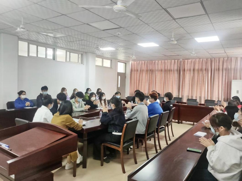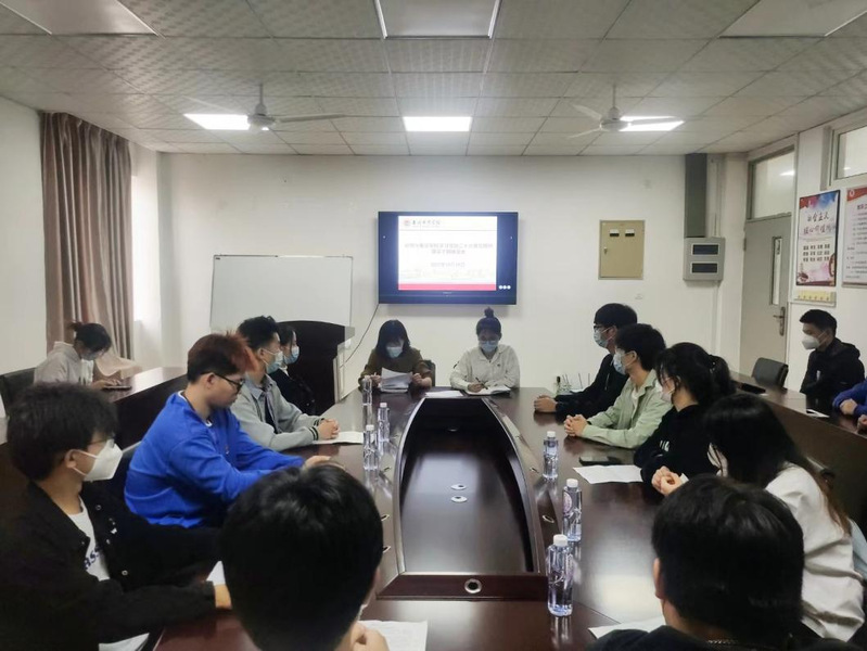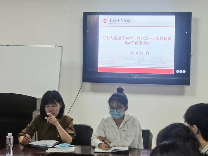 1018日下午,纺织与服装学院在王爱约701会议室举办学习党的二十大精神团学干部座谈会。院学工办主任、团委书记聂莹,辅导员廖春霖及团学干部代表参加。