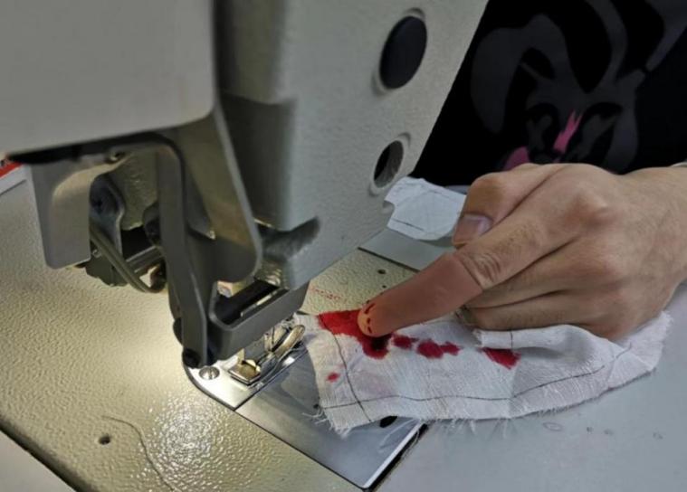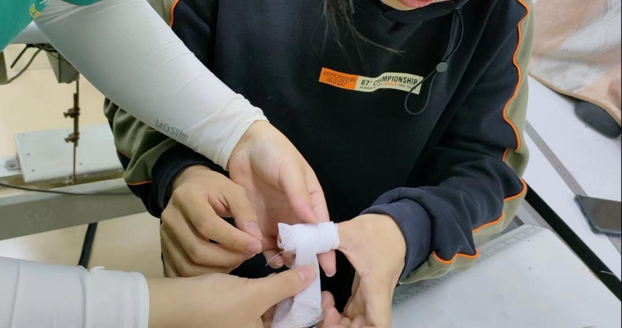 此次演习有学院副院长徐海燕、专任教师张艳、实验中心陈艳秋等师生代表约15人一起参与王爱约楼608服装缝制工艺室的演练现场。演练开始于学生的课堂中,学生在操作缝纫机进行缝制面料过程中,由于学生操作不当使得缝纫机速度过快,有3位同学导致缝纫机机针戳伤学生的食指、手指被缝纫机扎穿。