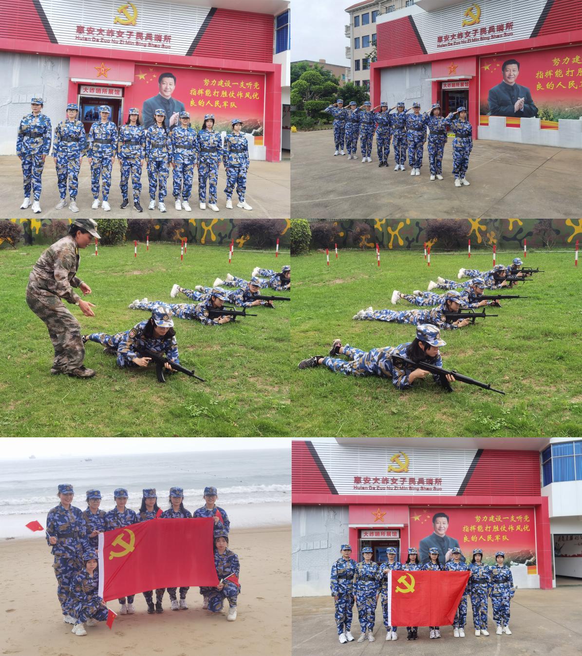 除了学习女民兵的革命传统和光荣历史,惠安女民兵哨所班长还亲自带领同学们进行军事训练。训练分为六个部分:军姿定型、停止间转法、敬礼与礼毕、齐步行进与停止、原地踏步走、持枪战术动作演练。训练时,大家都全神贯注,精神抖擞,练得特别认真。尤其是卧姿射击训练中,得到民兵班长手把手的指导,同学们很快掌握了要领,以战斗队形一字排开,俨然是一支训练有素、“召之即来,来之能战,战之必胜”的劲旅,获得了班长的表扬。