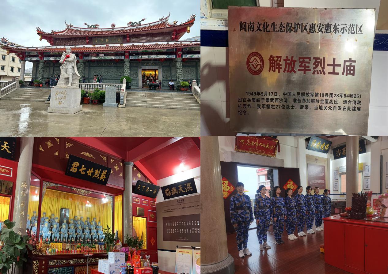 队员们通过参观解放军庙并观看石碑了解了该庙的创建历史背景。1949年中华人民共和国成立前夕,叶飞将军带领的中国人民解放军十兵团28军84师251团,挥师来到崇武金沙湾进行登陆训练,突然遭到敌机的轰炸,并且当地老百姓也受到牵连。那时,有一位名叫曾恨的小女孩暴露在敌机炸弹轰击之下,说时迟那时快,五位解放军战士奋不顾身,舍身救下小女孩,用血肉之躯保护她,当时在场的解放军战士中共有24位同志牺牲,加上后来该部队在别处牺牲的三位烈士,一共27位烈士。之后为了表达自己对解放军战士的感谢和敬仰,这位小女孩长大后四处奔波募集资金,建成了全国独一无二的烈士庙,名为廿七君庙。全国人大常委会副委员长叶飞同志特地为该庙供奉的27位烈士题词“为了人民,死得光荣”。就在参观崇武解放军寺庙的时候,波涛汹涌的大海上忽然大雨滂沱,正可谓“忽报人间曾伏虎,泪飞顿作倾盆雨”。师生们怀着崇高的敬意,共同深切缅怀和祭奠这27位英勇的解放军烈士。