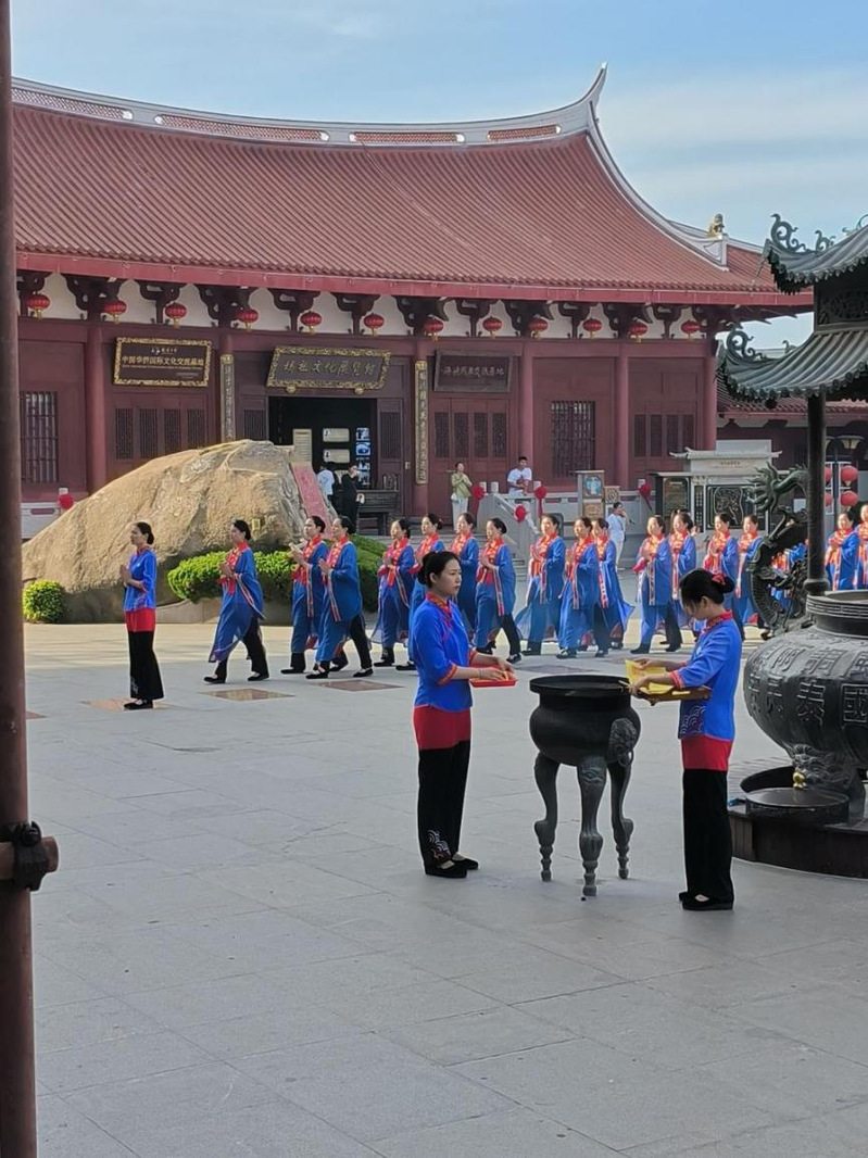 湄洲女服饰,是莆田湄洲岛上女子的一种传统装扮,跨越千年,世代相传,2022年列入省级非物质文化遗产项目。7月5日,实践团抵达莆田湄洲岛,来到此行的第一站——湄洲妈祖祖庙,“沉浸式”感受非遗文化。