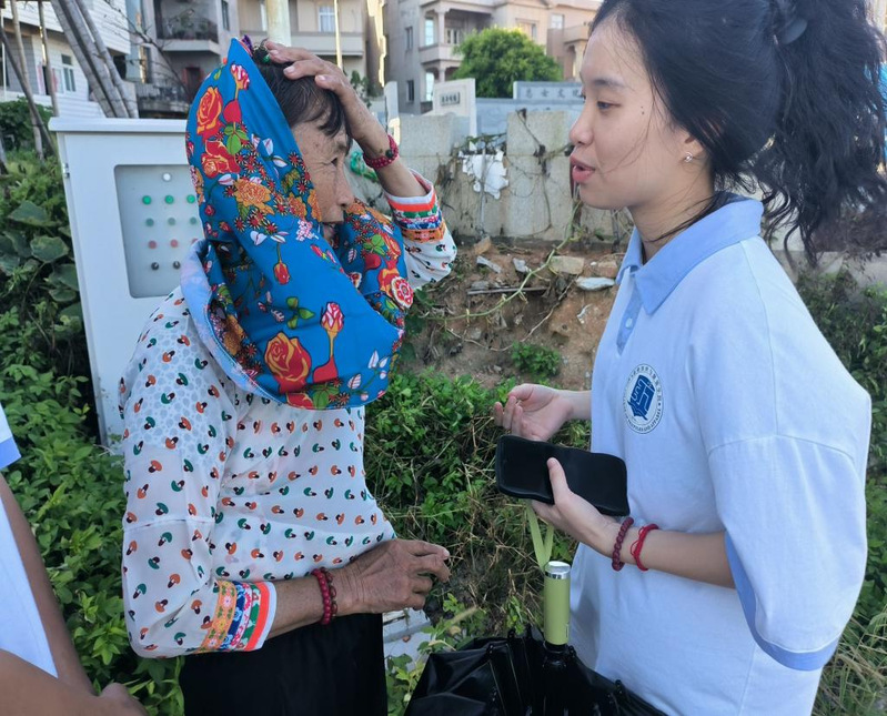 为了进一步了解非遗文化的传承与发展现状,实践队成员穿上独具特色的蟳埔服饰,亲身体验蟳埔女服饰头饰文化。成员们对当地居民进行访谈,并发放调查问卷,调研居民对蟳埔女服饰文化的认识和理解。与此同时,实践队成员深入蟳埔社区开展志愿服务活动,对杂草、垃圾和死角进行了集中清理,积极将理论学习的心得转化为服务群众的实际行动。