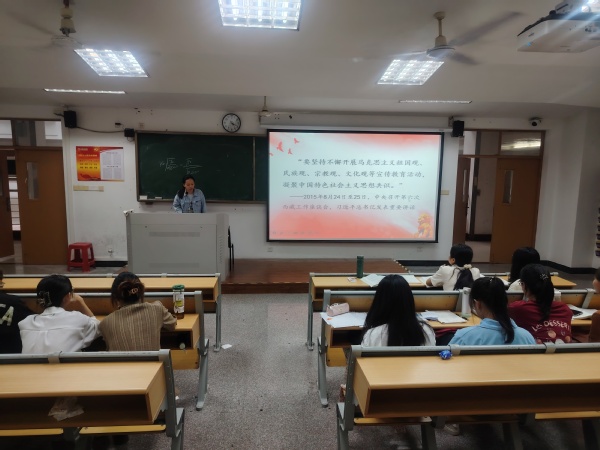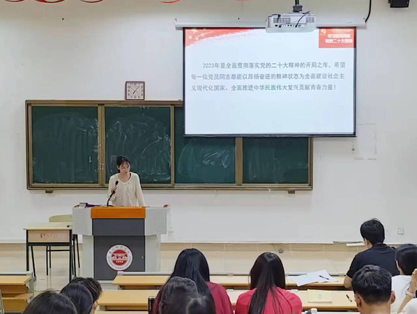 辅导员李晓希以“马克思主义宗教观和党的宗教政策”为主题,对我国宗教政策进行了详细解读,从我国民族的基本情况和特点、党的宗教工作基本方针等方面进行了全面的阐述,带领同学们正确把握民族宗教政策,认识宗教的本质,引导广大师生牢固树立马克思主义宗教观。此外,李晓希还讲授了“学习二十大 奋进新征程”主题团课。