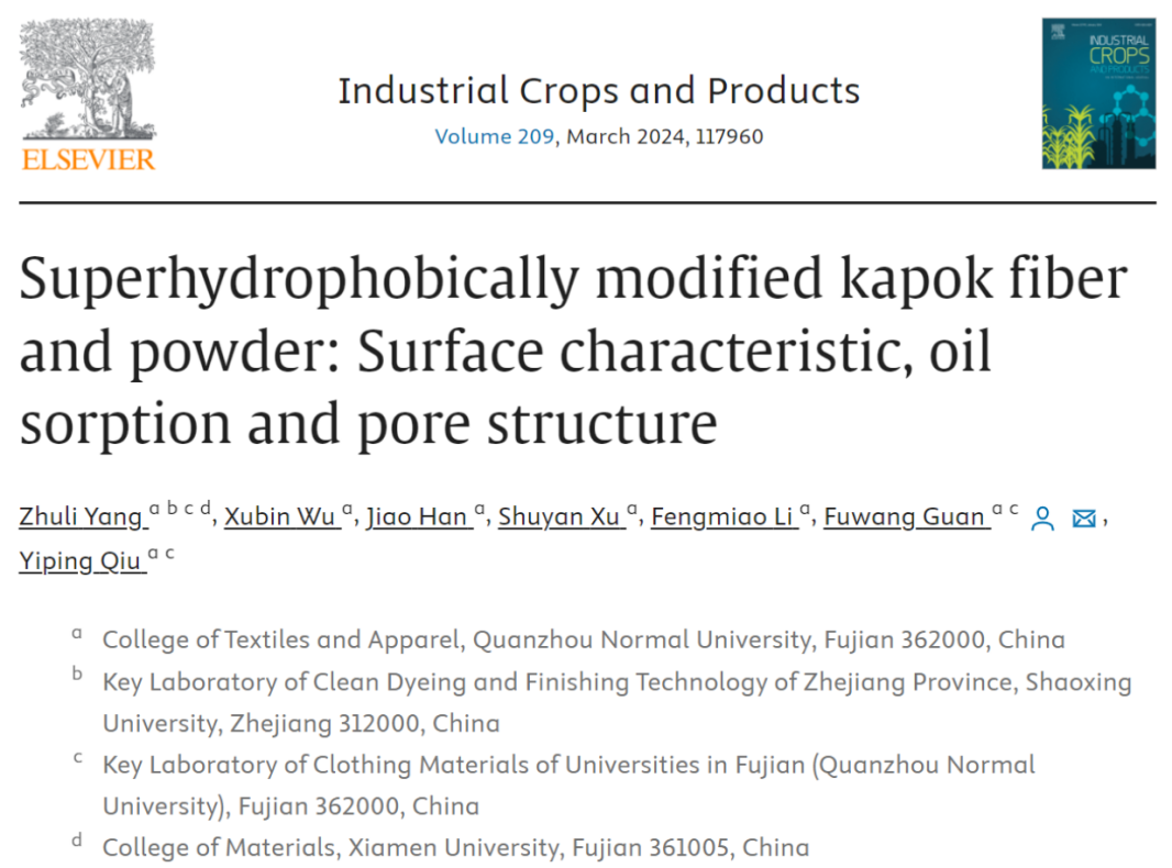 近日,国际著名期刊《Industrial Crops and Products》(IF:5.9,中国科学院一区,TOP期刊)在线发表了纺织与服装学院纺织工程系杨竹丽副教授的最新研究成果,论文题目为“Superhydrophobically modified kapok fiber and powder: Surface characteristic, oil sorption and pore structure”。纺织与服装学院为第一署名单位,杨竹丽副教授为第一作者,通讯作者为该系关福旺副教授。该研究得到福建省自然科学基金(2021J05187)、浙江省清洁染整技术研究重点实验室开放基金(QJRZ2213)和英国威廉希尔公司官网人才引进与科研启动项目(H18024/18028)的资