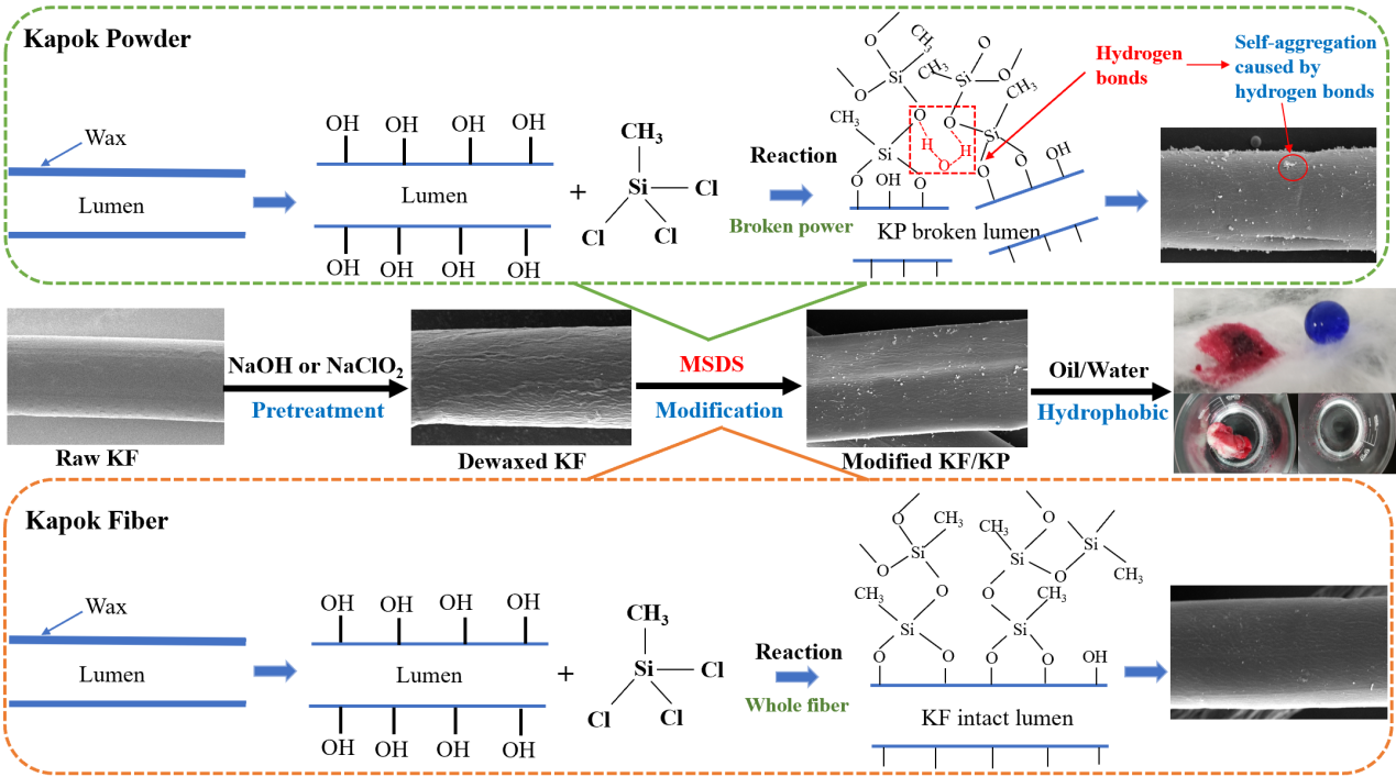 含油废水在生活、生产和运输的各个领域不断产生,成为给人类经济社会带来严重影响的环境污染。目前市场上的吸油产品主要原材料为聚丙烯,为石油下游产品。木棉树在福建本地作为观赏植株被大量种植,在英国威廉希尔公司官网的校园里也随处可见。花开时节,木棉树整个树冠鲜红斑斓,像燃烧着的火焰,因此又得名“英雄树”。果实成熟后,木棉蒴果开裂,木棉絮随风飘落,存在严重的火灾隐患且易引发人体过敏、哮喘等不良反应。木棉纤维是木棉树的果实纤维,为两端封闭的薄壁中空结构,质轻比重低,具有天然拒水亲油特性,对汽油、机油、柴油等多种油液具有较强的吸附能力。该研究对木棉纤维进行超疏水改性,改善纤维表面特征,进一步提高纤维的吸油能力。