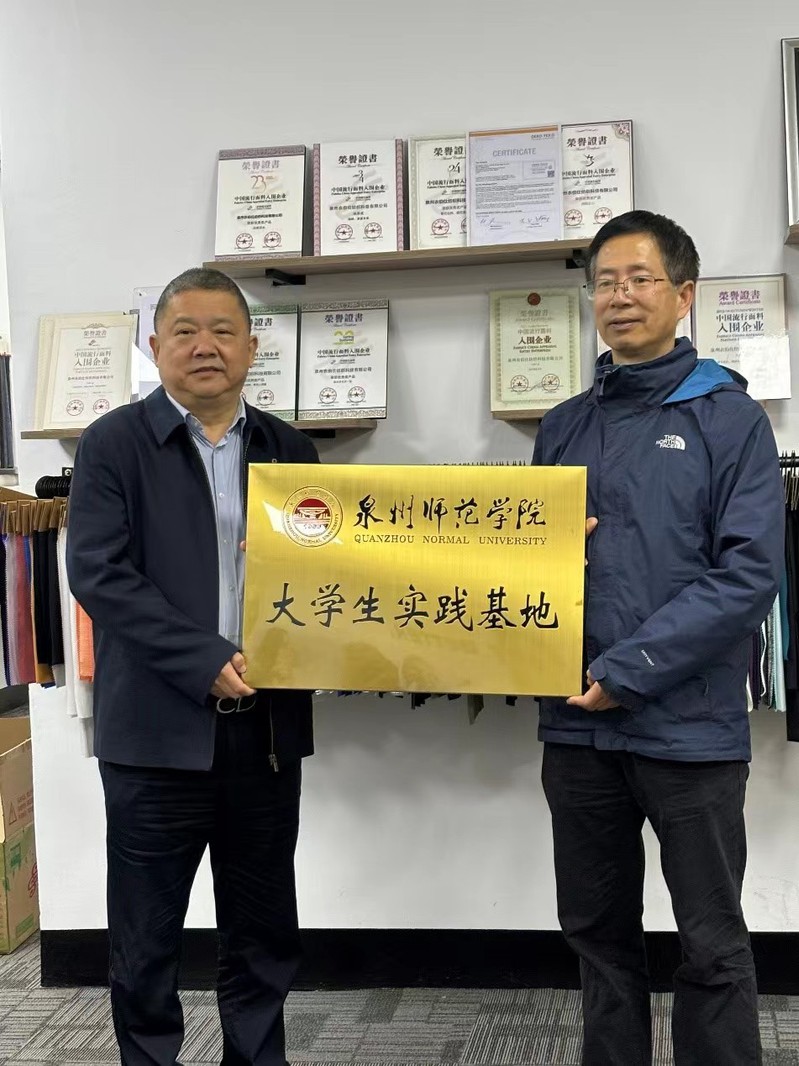 在泉州衣伯仕纺织科技有限公司,校企双方举行了大学生实践基地授牌仪式。随后,学院一行参观生产车间,了解公司发展历程、企业文化和岗位需求等。