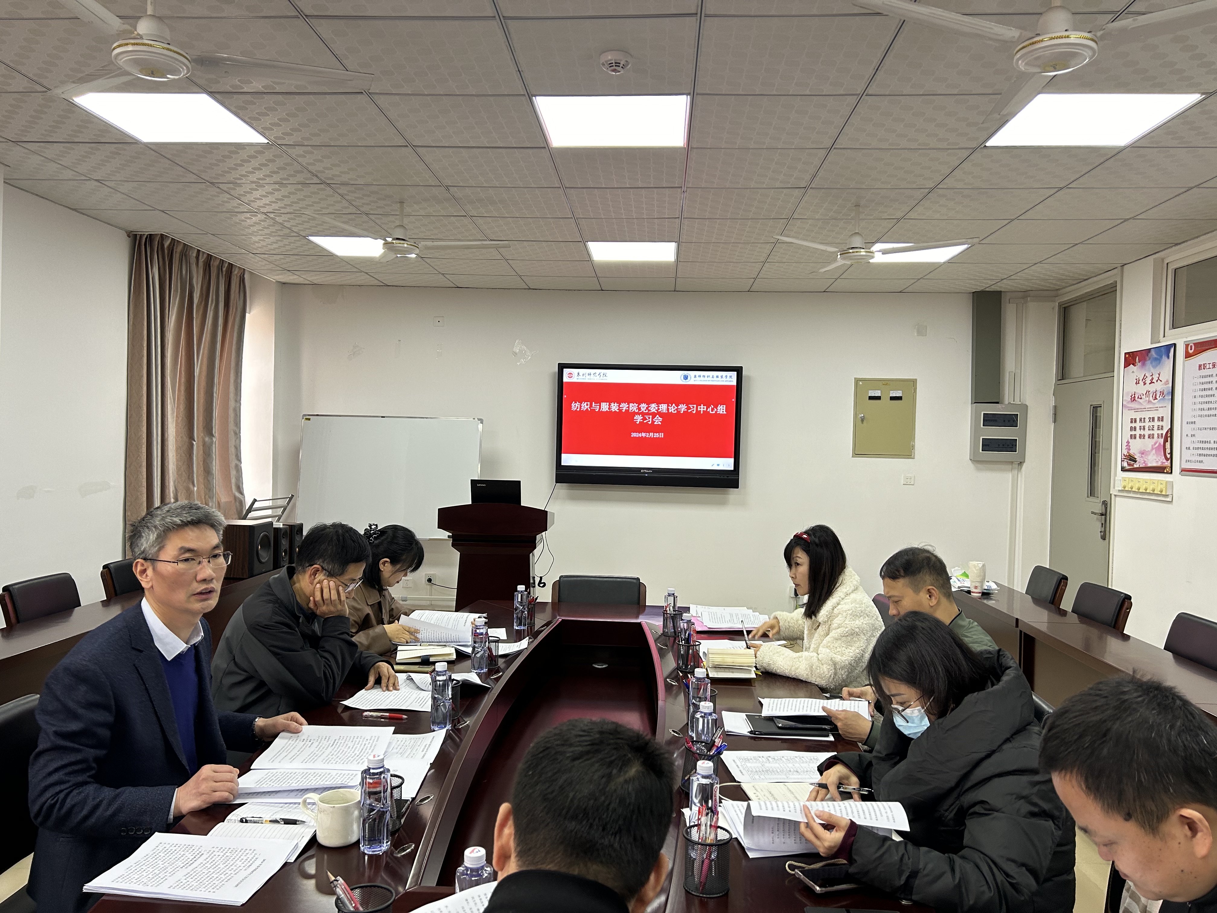 2月25日下午,纺织与服装学院党委理论学习中心组专题学习习近平总书记在纪念毛泽东同志诞辰130周年座谈会上的重要讲话精神。学院领导班子成员、党委委员、党支部书记、系(办、中心)主任参加。党委书记黄国波主持会议。