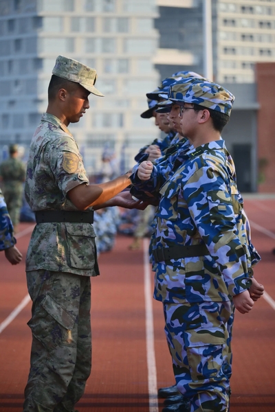 在此次军训中,纺织与服装学院的同学们接受了严格规范的队列训练,包含立正、稍息、四面转体、齐步走、跑步走、敬礼等内容。同时,为呈现多样化的军训成果,同学们还学习了匕首操、军体拳、棍术、旗语操、刺杀操、战术方阵等军事技能。全体参训人员充分发扬不怕苦不怕累的精神,斗志昂扬,相互鼓励,共同进步。在教官的精心指导下,训练动作规范标准、整齐划一,步伐铿锵有力,口号高亢嘹亮,展现了纺服学子良好的精神风貌。期间,学院党委书记黄国波多次前往军训现场,看望慰问军训教官和参训新生。