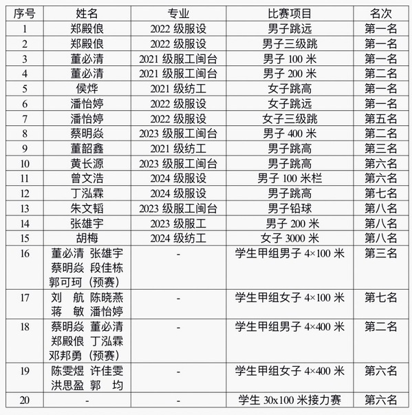 附:第42届校运会纺织与服装学院学生甲组获奖名单
