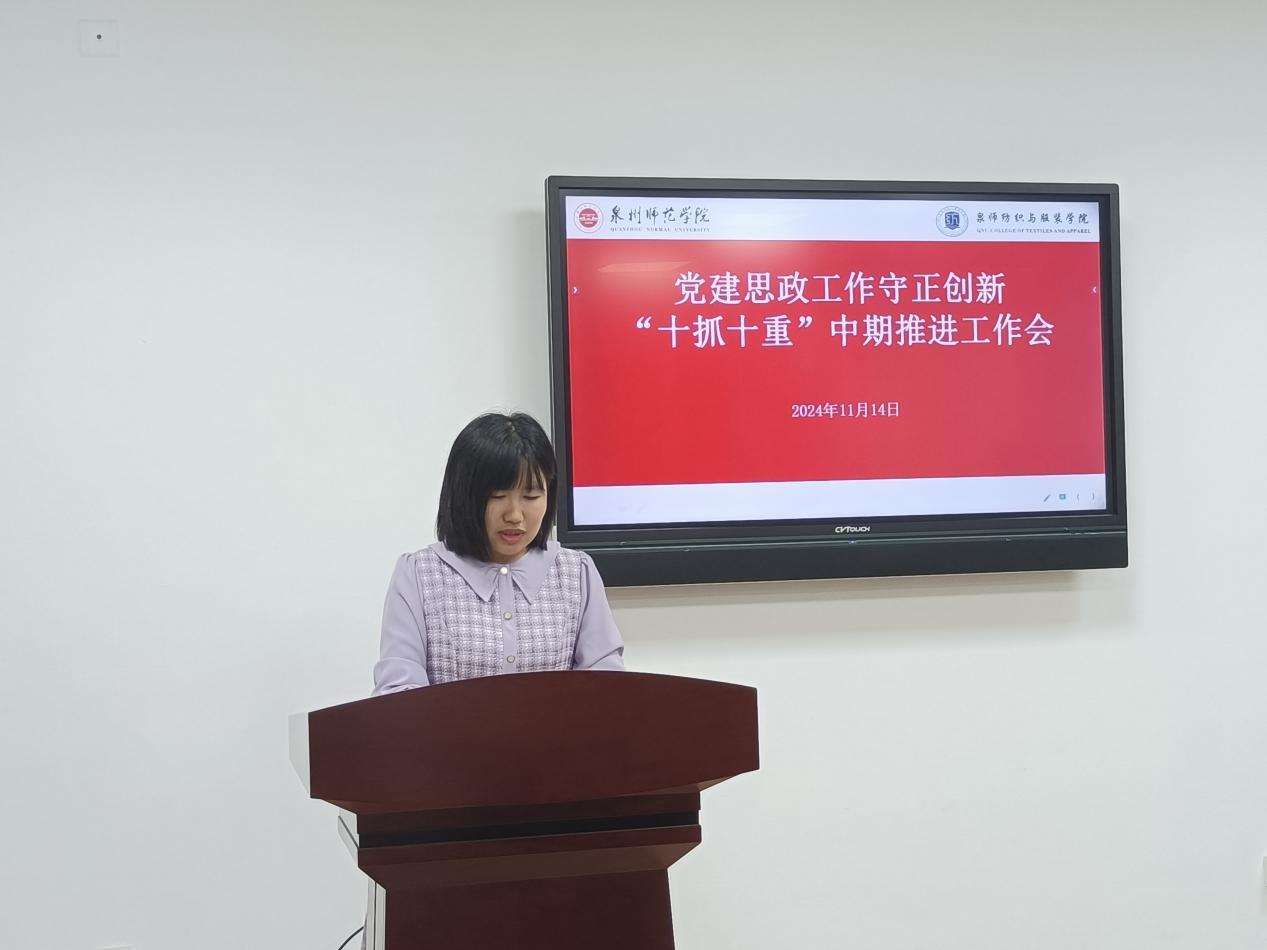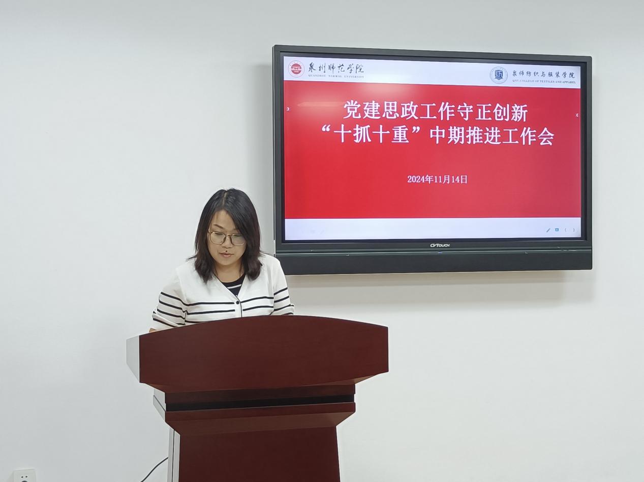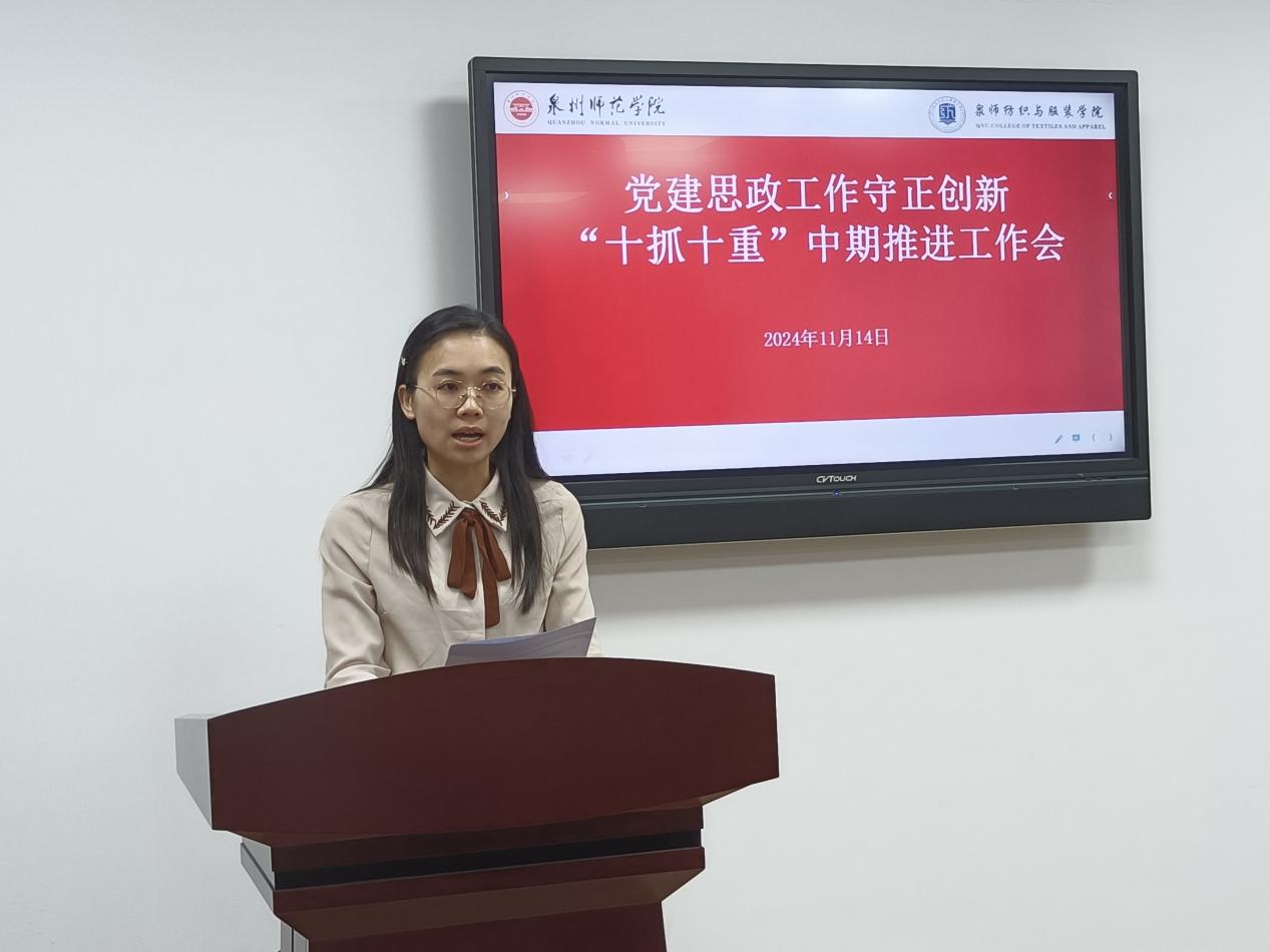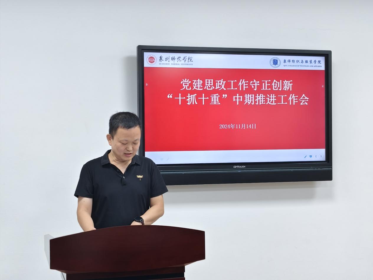 会议要求,要全面系统总结学院党建思政工作主要做法和成效经验,在原有基础上着力构建纺织与服装学院党建思政工作“五聚焦五促进五提升”工作模式,进一步提升党建思政工作质量和水平。一是“五聚焦”:聚焦正确政治方向、聚焦教育初心使命、聚焦基层组织建设、聚焦学院事业发展、聚焦教师队伍成长。二是“五促进”:以“效力纺服”促进高质量发展,争当学校高质量发展“主力军”;以“品质纺服”促进高质量发展,争当学校高质量发展“样板地”;以“创新纺服”促进高质量发展,争当学校高质量发展“先锋队”;以“开放纺服”促进高质量发展,争当学校高质量发展“融合地”;以“青春纺服”促进高质量发展,争当学校高质量发展“新高地”。三是“五提升”:着力提升管党治党水平、着力提升内涵建设水平、着力提升协同育人水平、着力提升成果转化水平、着力提升责任落实水平。全院师生要按照校党委工作部署,以更加饱满的热情、更加务实的作风、更加有力的措施,扎实推进党建和思政工作,以高质量党建引领保障事业高质量发展,奋力答好“强国建设、泉师何为”的纺织与服装学院答卷。