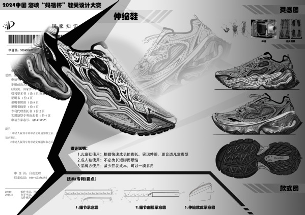 本届大赛由福建省工信厅、莆田市政府指导,湄洲湾职业技术学院、莆田市工信局、莆田市二轻工业联社主办。大赛以“AI设计,赋能鞋业产业发展”为主题,自今年7月15日启动以来,共征集到国内外众多鞋类企业、高等院校、设计机构以及独立设计师共860多件高质量的参赛作品。本次大赛分为设计稿、样品鞋制作、AI设计、PPT路演以及展示鞋楦、样板实物等环节,并增设了里、面、线材料应用的合理性及针车工艺、印刷工艺等打分项,对选手的综合素质能力要求比较高。纺织与服装学院李秀琴同学作品凭借独特创意和人性化设计在一众优秀作品中脱颖而出,成为学生组“金奖”获得者。