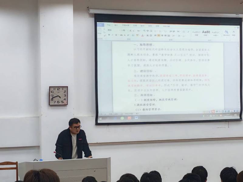 会上,系主任余燕忠对照本科教育教学审核评估指标体系,系统总结了学院在学风建设、课堂管理等方面存在的短板与问题。他强调,全体师生要以审核评估为契机,牢固树立“学生中心、产出导向、持续改进”理念,强化时间观念,规范纪律管理,打造“无手机课堂”,从课堂教学、日常管理等环节协同发力,推动教风学风互促共进,全面提升人才培养质量,为迎接本科教育教学审核评估奠定坚实基础。