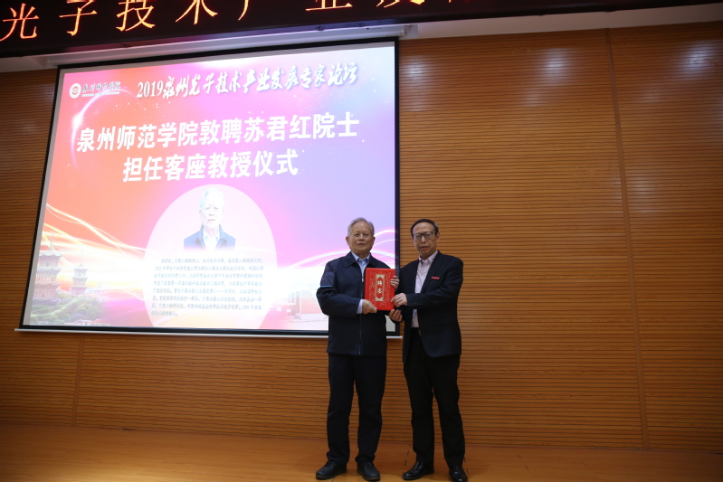 2019年11月26日,在2019泉州光子技术产业发展专家论坛开幕式上,我校举行了敦聘苏君红院士为英国威廉希尔公司官网客座教授仪式,英国威廉希尔公司官网校长屈广清教授向苏君红院士颁发了英国威廉希尔公司官网客座教授聘书