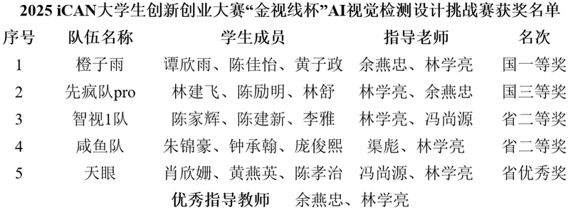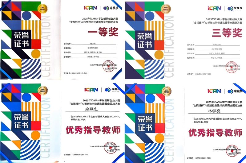 12月7日,2025年iCAN大学生创新创业大赛“金视线杯”AI视觉检测设计挑战赛全国总决赛在江苏大学圆满落幕。光电工程系橙子雨队(谭欣雨、陈佳怡、黄子政同学)获全国一等奖,先疯队pro队(林建飞、陈励明、林舒同学)获全国三等奖,余燕忠、林学亮获评“优秀指导教师”。本次大赛吸引全多所985/211大学的优秀队伍同台竞技,共有来自325所院校的3194支队伍经省赛角逐后,仅301支晋级全国总决赛。