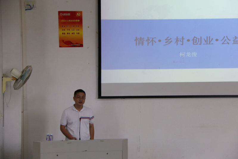 傅志雄书记向同学们介绍了柯龙俊校友毕业十年来在创业方面取得的成绩,柯龙俊校友现为泉州市泉港工业技术学校校长、泉州市优加创业咨询服务有限公司总经理、泉港区青年商会副会长兼秘书长以及SIYB创业培训讲师,曾荣获“泉州市青年创业良师益友”、“泉州青年五四奖章”等荣誉称号。希望同学们吸取优秀校友的人生经验,以柯龙俊为榜样,在自己的成长成才的道路上找准方向,奋发有为。