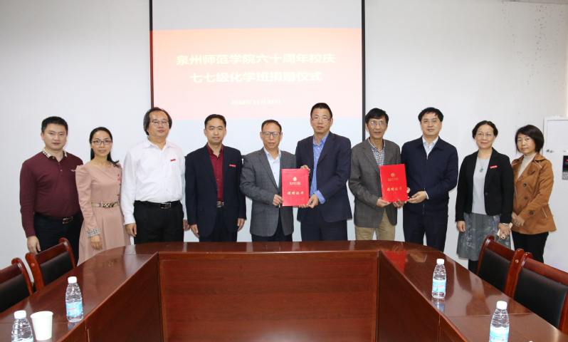 2018年11月23日,吴季怀、王惠生两位校友代表1977级化学班带着珍贵的礼物回归母校,庆祝母校建校六十周年。校长屈广清、纪委书记邱银富、化工与材料学院党委书记傅志雄、副院长李国清、有关校部机关负责人以及学院部分教师参加了捐赠仪式。仪式由化工与材料学院副院长李国清主持。