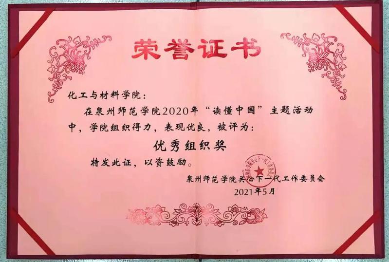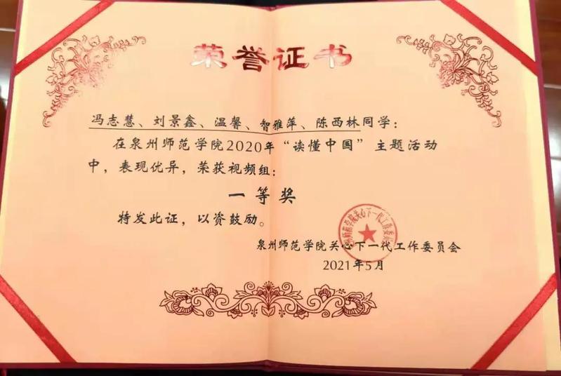 冯志慧等同学拍摄的作品“读懂您,读懂我的祖国”微视频,荣获2020年“读懂中国”主题教育活动一等奖,我院组织得力,荣获优秀组织奖。