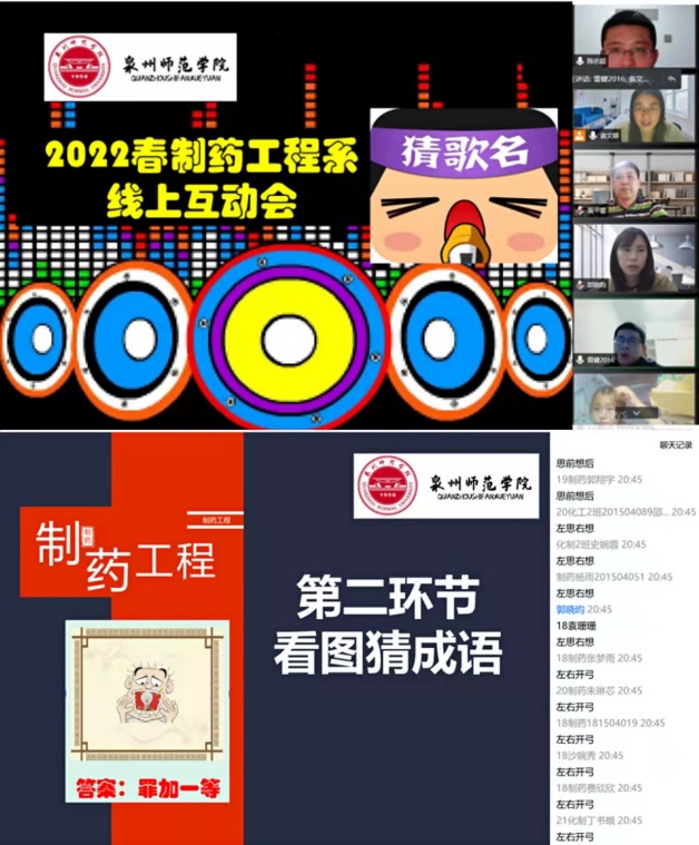 制药工程系师生的线上互动以游戏环节拉开序幕,包括“听歌猜歌名”及“看图猜成语”两个内容。在“听歌猜歌名”环节中,同学们抢答着歌名,欣赏着歌声,缓解了疫情所带来的紧张感。同学们在做好防护的前提下表演了精彩的节目。有小组唱《北京东路的日子》,有舞蹈“拉丁恰恰”……师生在线上不吝赞美,纷纷在聊天版面打上“厉害”、“棒棒哒”、“666”等字眼。最后,全系师生合唱了《真心英雄》, 用歌声致敬疫情中每一个平凡英雄,致敬在疫情期间“逆行”为同学们服务的志愿者老师们。