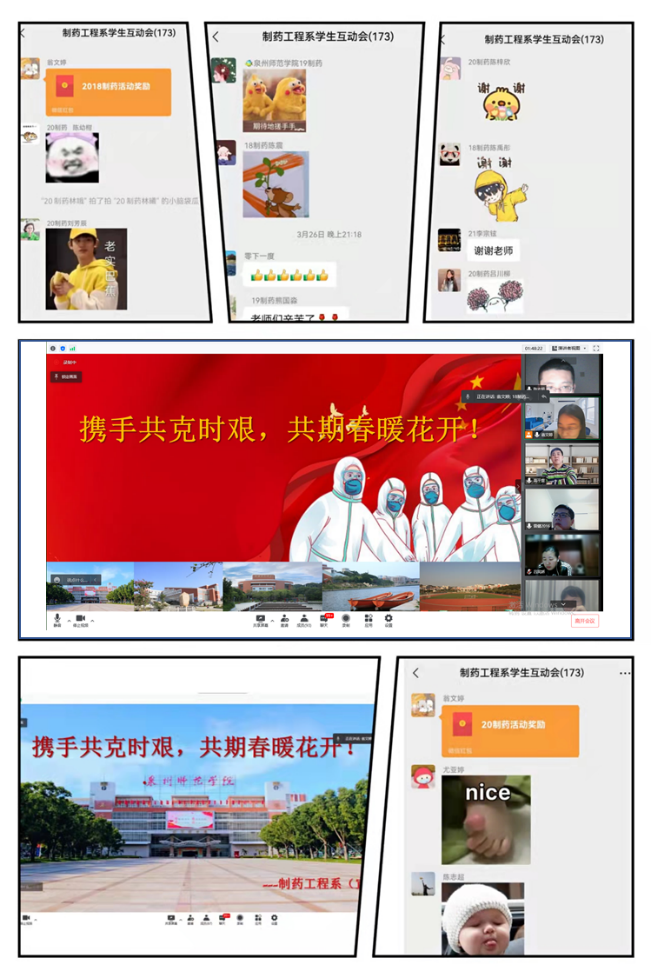 在全校师生员工众志成城、齐心协力防控疫情的关键时刻,化工与材料学院所属4个系的老师,利用周末时间,分别组织了丰富多彩、形式多样、富有专业特色的师生线上互动交流活动,为在宿舍区封闭管理已经近两周的同学纾解心理压力,调节课余生活。