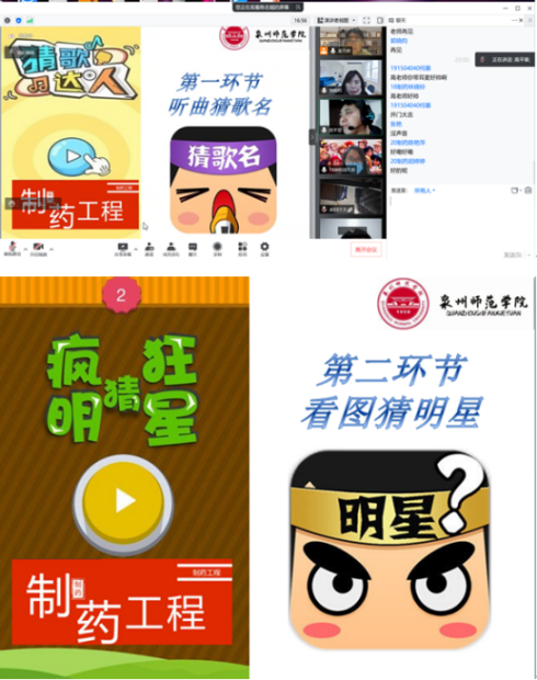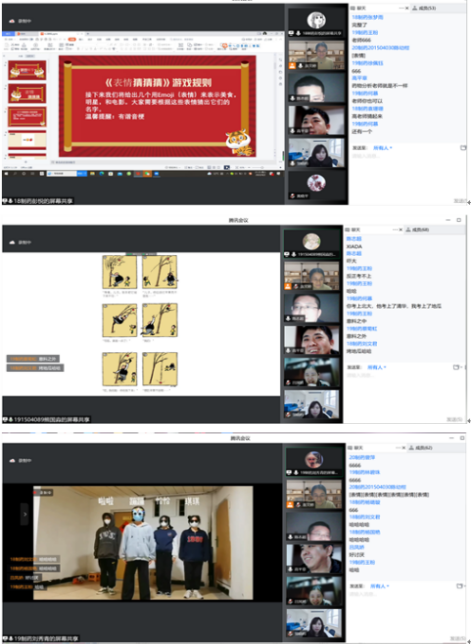 继第一次线上活动后,制药工程系的同学们表示线上活动非常有趣,很好地纾解大家在疫情防控期间的烦闷心情。本周“互动会”以游戏环节拉开序幕,包括“听曲猜歌名”及“看图猜明星”两个内容。在才艺展示活动中,同学们表演了小品《父子故事》、舞蹈《小鸡恰恰舞》、小游戏《海龟汤》《表情猜猜猜》等丰富多彩的学生节目。活动尾声阶段,师生线上畅聊,老师们倾听着同学们现阶段的心绪,并从心理上给予他们更多的关切。