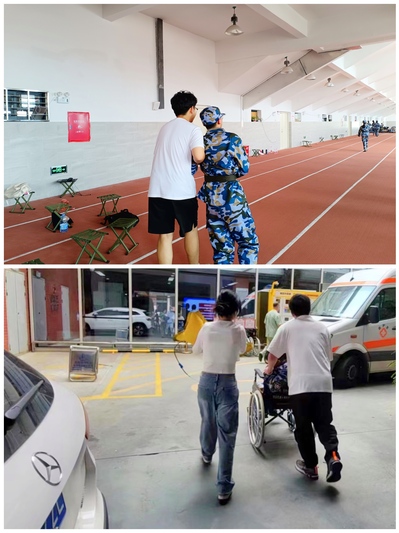 操场上,辅导员、助班轮流到现场关注学生训练情况,处理突发状况,及时为有需要的学生提供帮助。