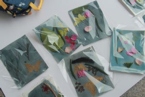 戴好手套、穿上围裙,我们开始了化学体验。我快速地刷好了溶液,吹干后,将校园里捡来的花草、叶子放到纸上,固定好后,我们拿着作品在太阳光下暴晒。活动中,大学生志愿者还为我们讲解蓝晒的化学原理。原来蓝晒使用了铁盐作为感光剂,通过阳光的曝光和化学处理过程,将图像转移到纸上。当这种经过处理的纸张被阳光曝光时,阳光中的紫外线会与柠檬酸铁铵发生反应,生成蓝色色素。听完课,我拿到了自己的作品:几只“蝴蝶”在“花丛”中飞舞。望着手中的作品,我不禁感慨化学的神奇,动手实践的快乐!(指导老师:杨桂珠)
