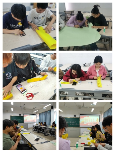 3月29日,班级成员在理工楼开展“折菊敬英烈”活动,用卡纸、剪刀等工具,自己动手折剪出一朵朵菊花,表达对革命先烈的缅怀之情。