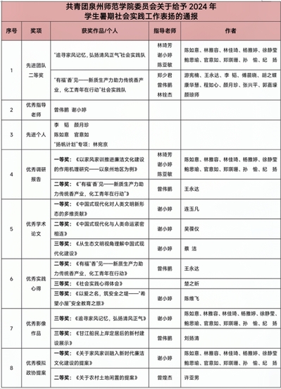 10月8日,中共福建省委教育工作委员会公布了“追寻领袖足迹 体悟伟大变革”2024年全省大学生暑期社会实践活动评选结果。化工与材料学院谢小婷老师获评“优秀实践个人”,实践队调研报告《以家风家训推进廉洁文化建设的作用机理研究——以泉州地区为例》(陈如意、林雅容、林佳琦、杨雅婷、徐静莹、鲍思瑜、官意如、郑琪珊、孙愉、纪扬)获“优秀实践成果”。