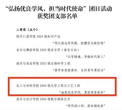 我院2024级化学工程与工艺2班在校团委“弘扬优良学风,担当时代使命”团日活动评比中获得二等奖