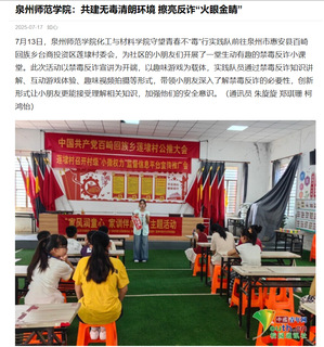 为积极响应“青春为中国式现代化挺膺担当”主题“三下乡”社会实践号召,增强青少年的禁毒反诈意识,化工与材料学院“守望青春不‘毒’行”实践队前往泉州市青少年社会保护中心、泉州市丰泽区林则徐禁毒教育基地、泉州市惠安县百崎回族乡台商投资区莲埭村委会等地开展一系列暑期社会实践活动。此次社会实践先后被中青校园、泉州东南早报等媒体报道,有效提升了社会实践活动的影响力。