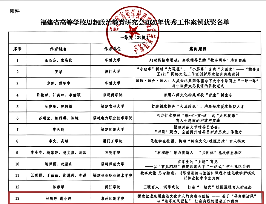 近日,福建省高等学校思想政治教育研究会公布《关于表彰福建省高等学校思想政治教育研究会2025年优秀工作案例的通知》。化工与材料学院案例《探索世遗泉州廉洁文化育人的实践与创新——基于“寻刺桐清风”与“追寻家风记忆”社会实践的思政工作案例》(林琦芳谢小婷)荣获一等奖。